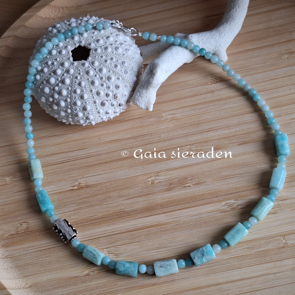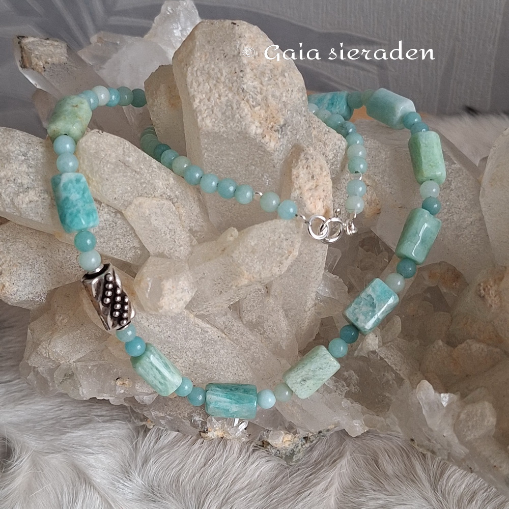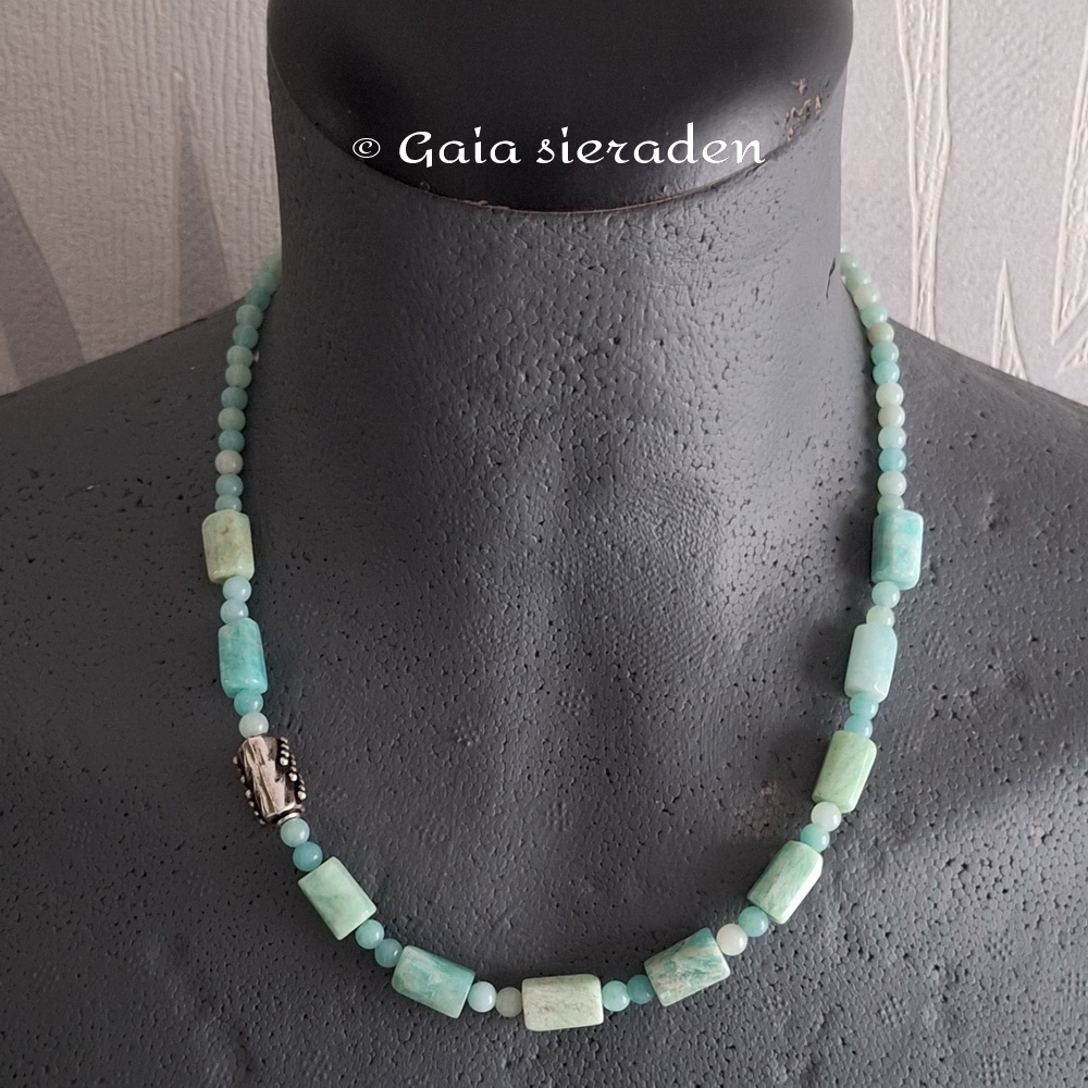 Amazoniet ketting Bali kraal: ketting van glanzend gepolijste Amazoniet staafjes. Samen op staaldraad geregen met kleine Amazoniet kraaltjes. Als blikvanger een mooie zilveren Bali kraal.