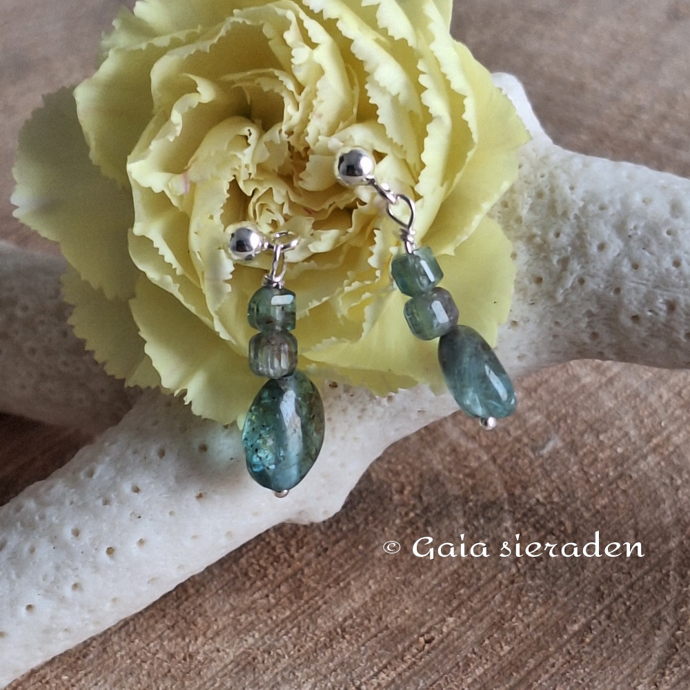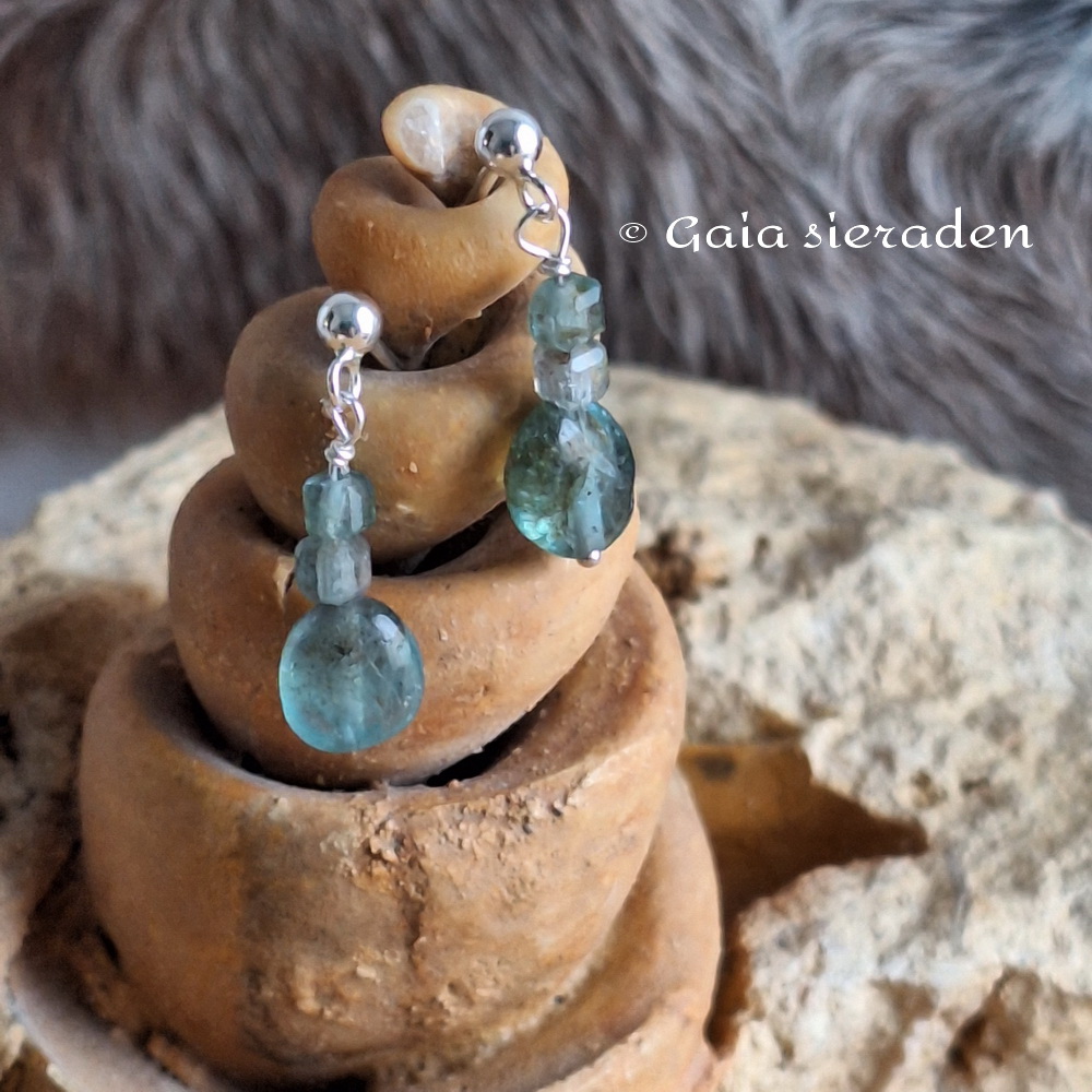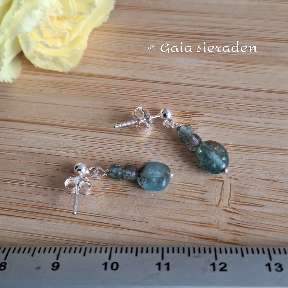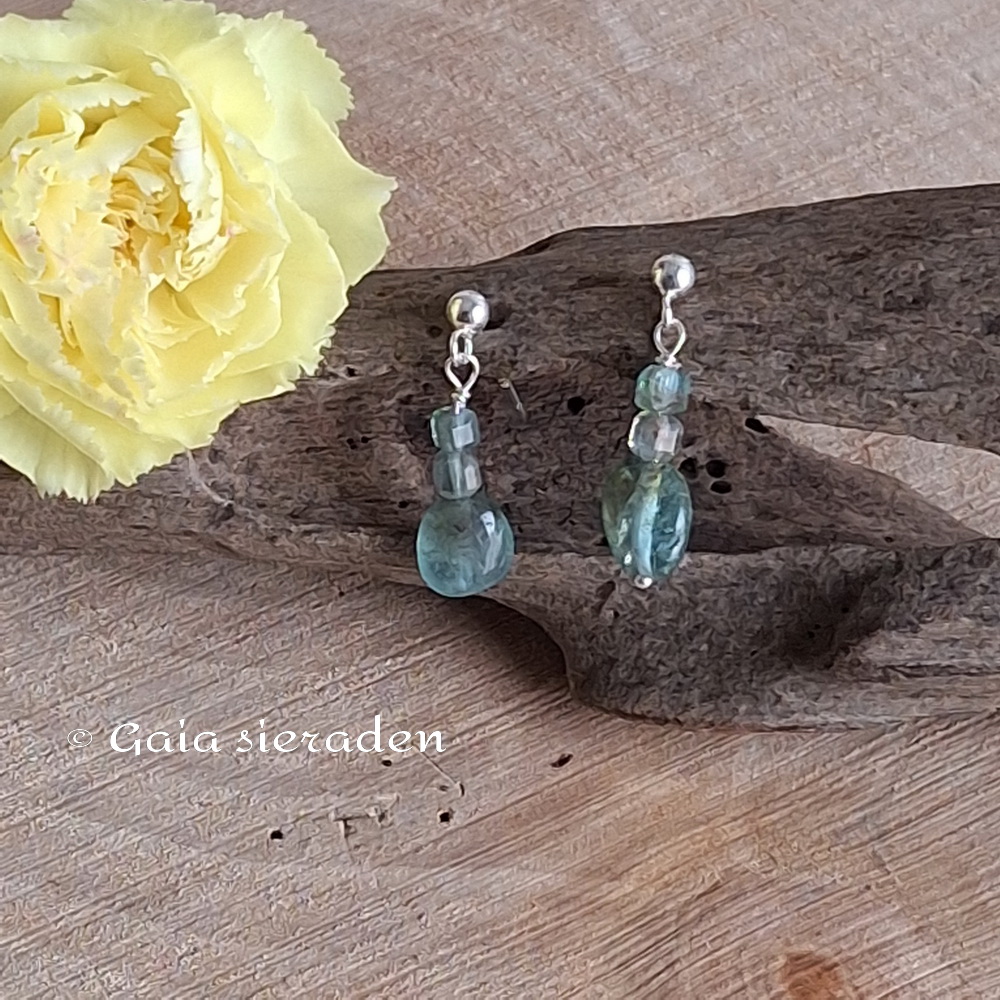 Apatiet groen oorsteker : Leuke oorsteker met een glanzend groen Apatiet freeform kraal en twee kleine vierkante gefacetteerde Apatietjes. Afgewerkt met een zilveren oorsteker.