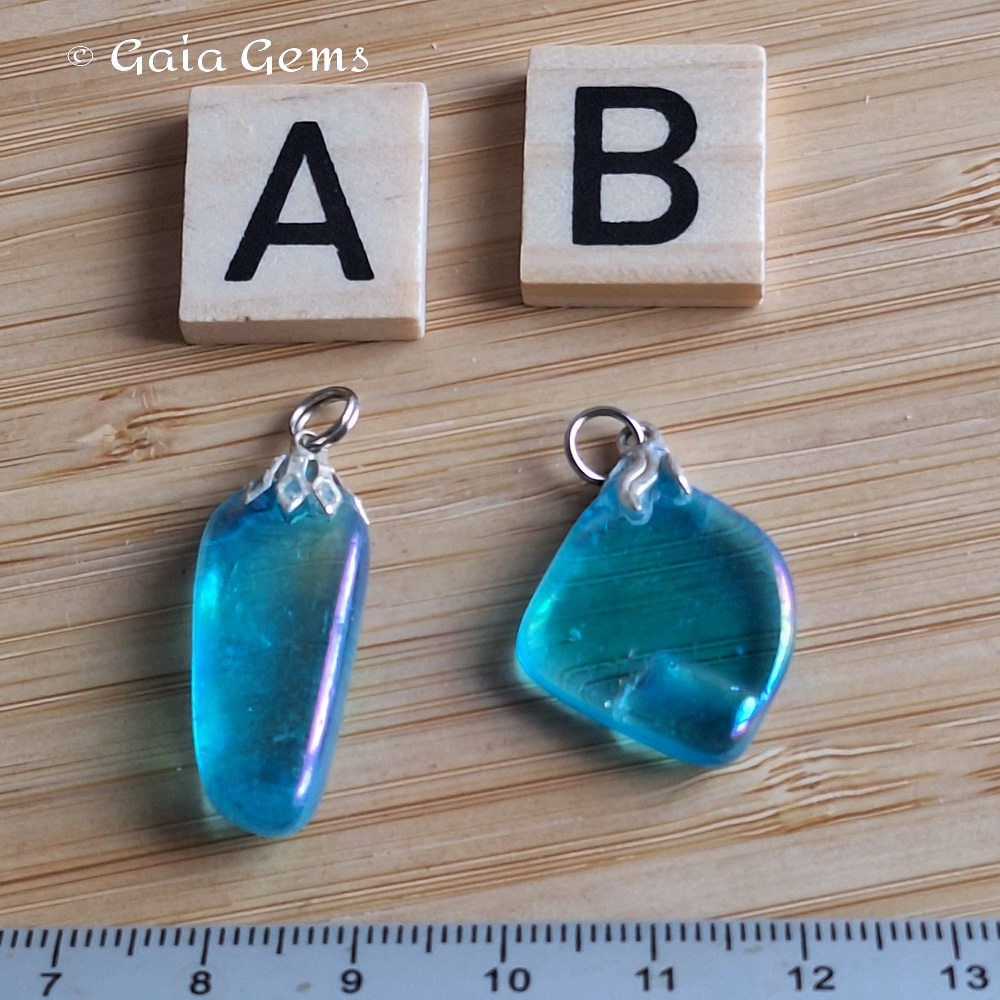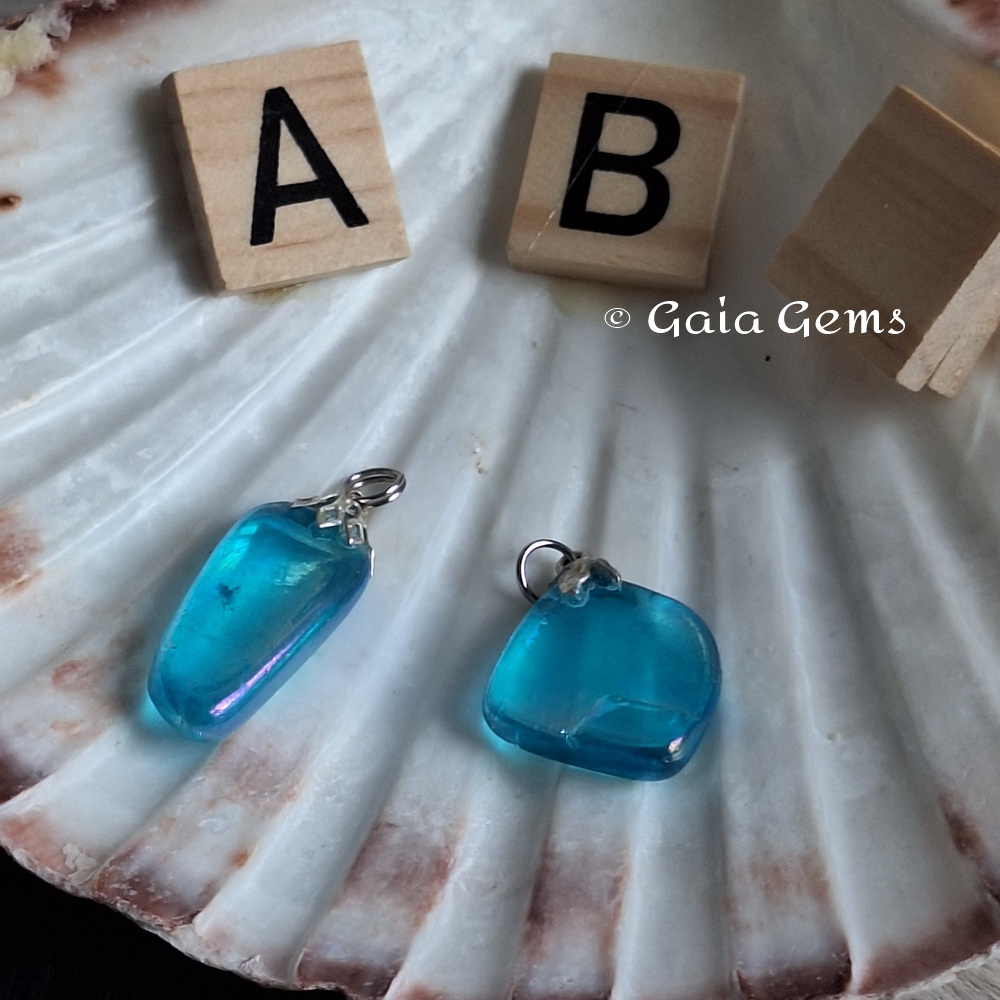 Aqua aura kwarts is bergkristal behandeld met goud waardoor het oppervlak een olieachtige glans met een regenboog aan kleuren gaat vertonen. Deze laag is permanent en kan er niet afgewassen worden.