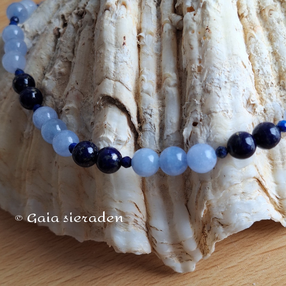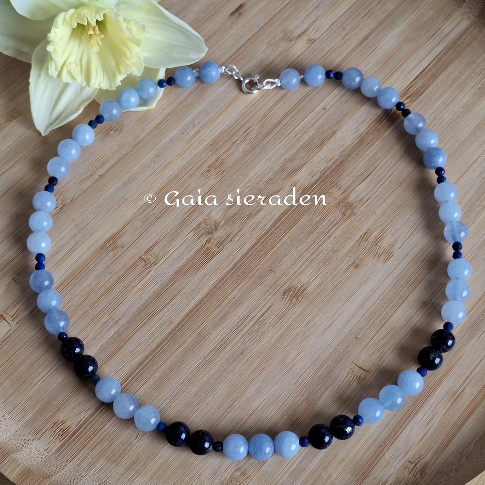 Aquamarijn ketting met Lapis Lazuli: ketting van glanzend gepolijste 8 mm bollen Aquamarijn en mooie donkere Lapis Lazuli. Tussen de kralen zijn kleine 4 cm. gefacteerde Lapis kraaltjes verwerkt. Afgewerkt met een zilveren veerslot.