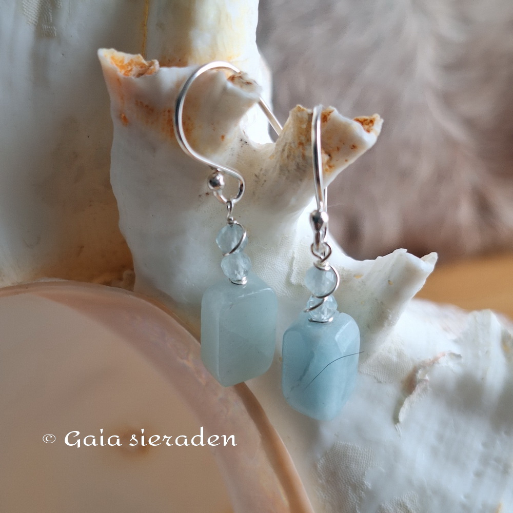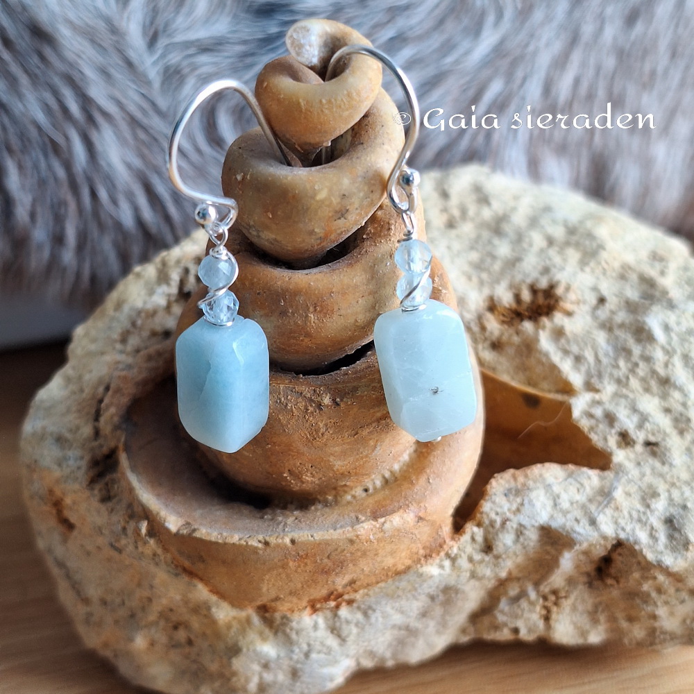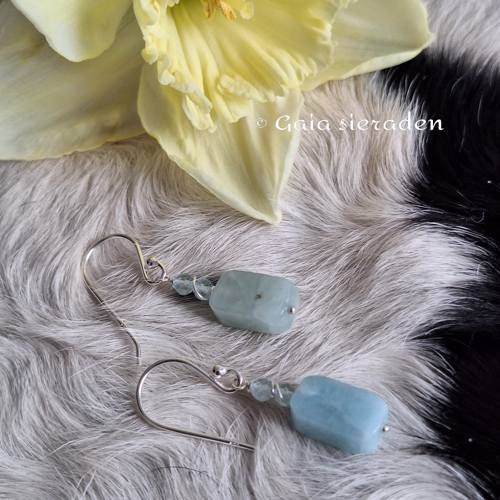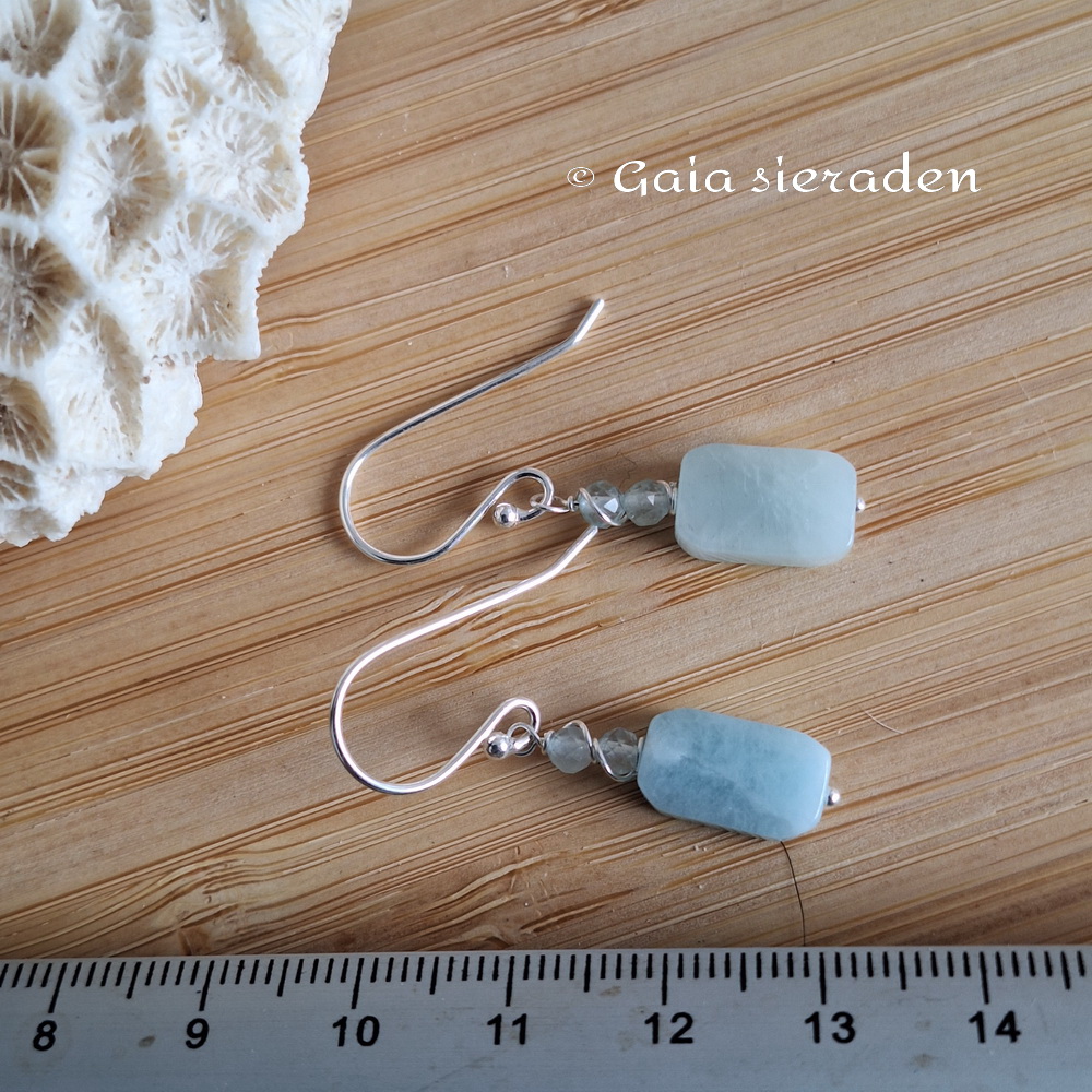 Aquamarijn oorbellen balkje : Leuke oorbellen van een langwerpig geslepen blokje Aquamarijn op zilveren pin met kleine heldere Aquamarijn kraaltjes in zilverdraad gevat. Afgewerkt met een zilveren oorhaak.