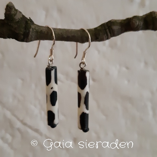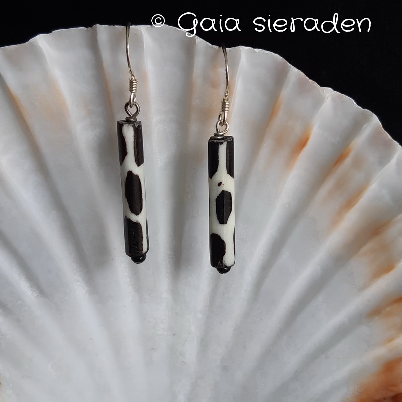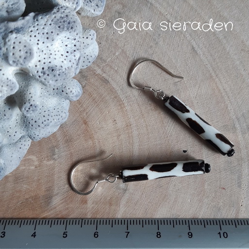 Been oorbellen giraffe: leuke handgesneden oorbellen van gebatikt been. Dit tribal motief lijkt een beetje op de vlekken van de giraffe. Deze batik kralen komen uit Kenia.