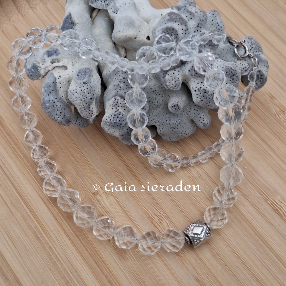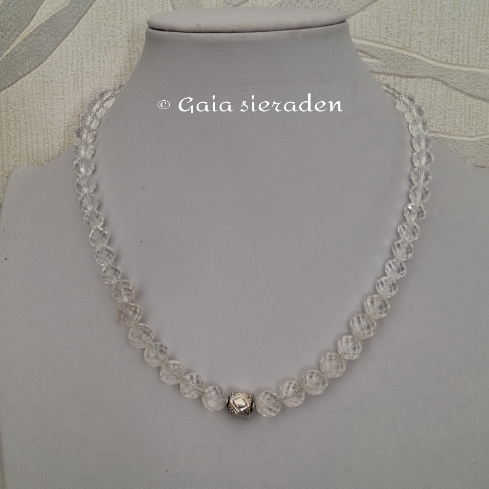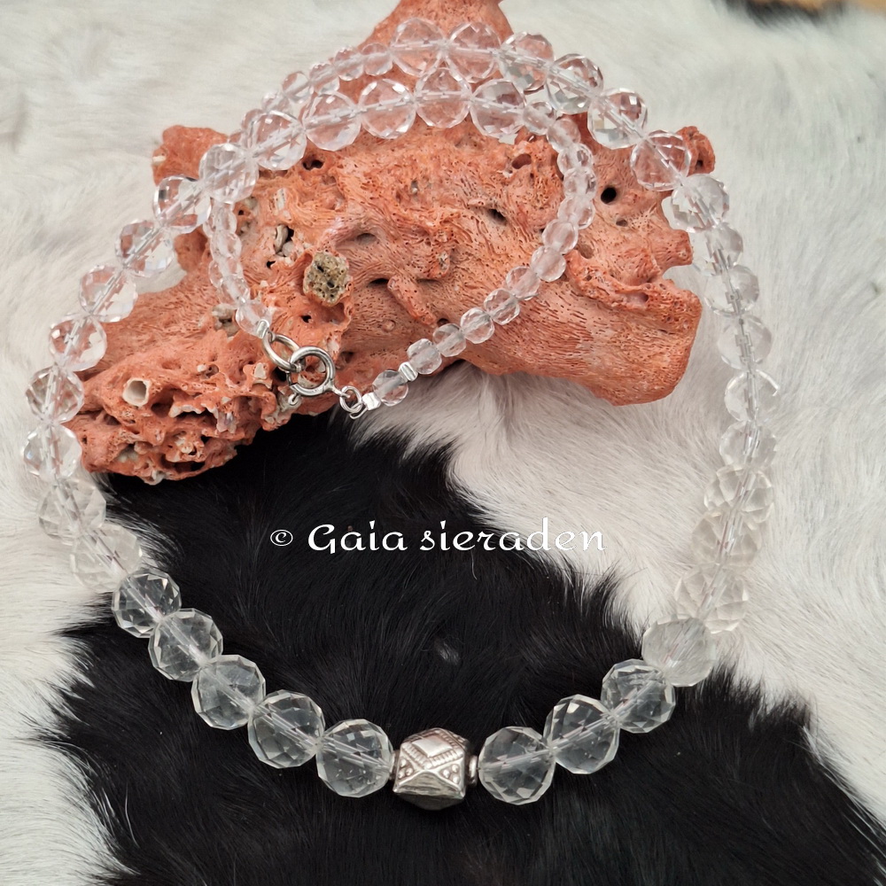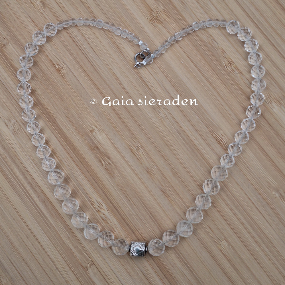 Bergkristal ketting Demeter ; de ketting heeft prachtige gefacetteerde kralen oplopend van 4 naar 9,5 mm. In het midden is een bewerkte 925 zilveren kraal geregen en is een mooie eye catcher. Een tijdloze elegante ketting.