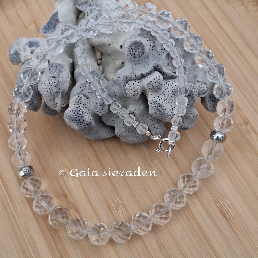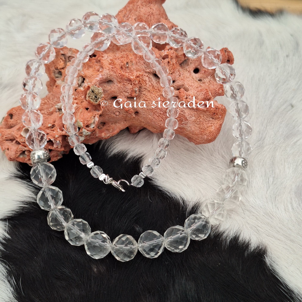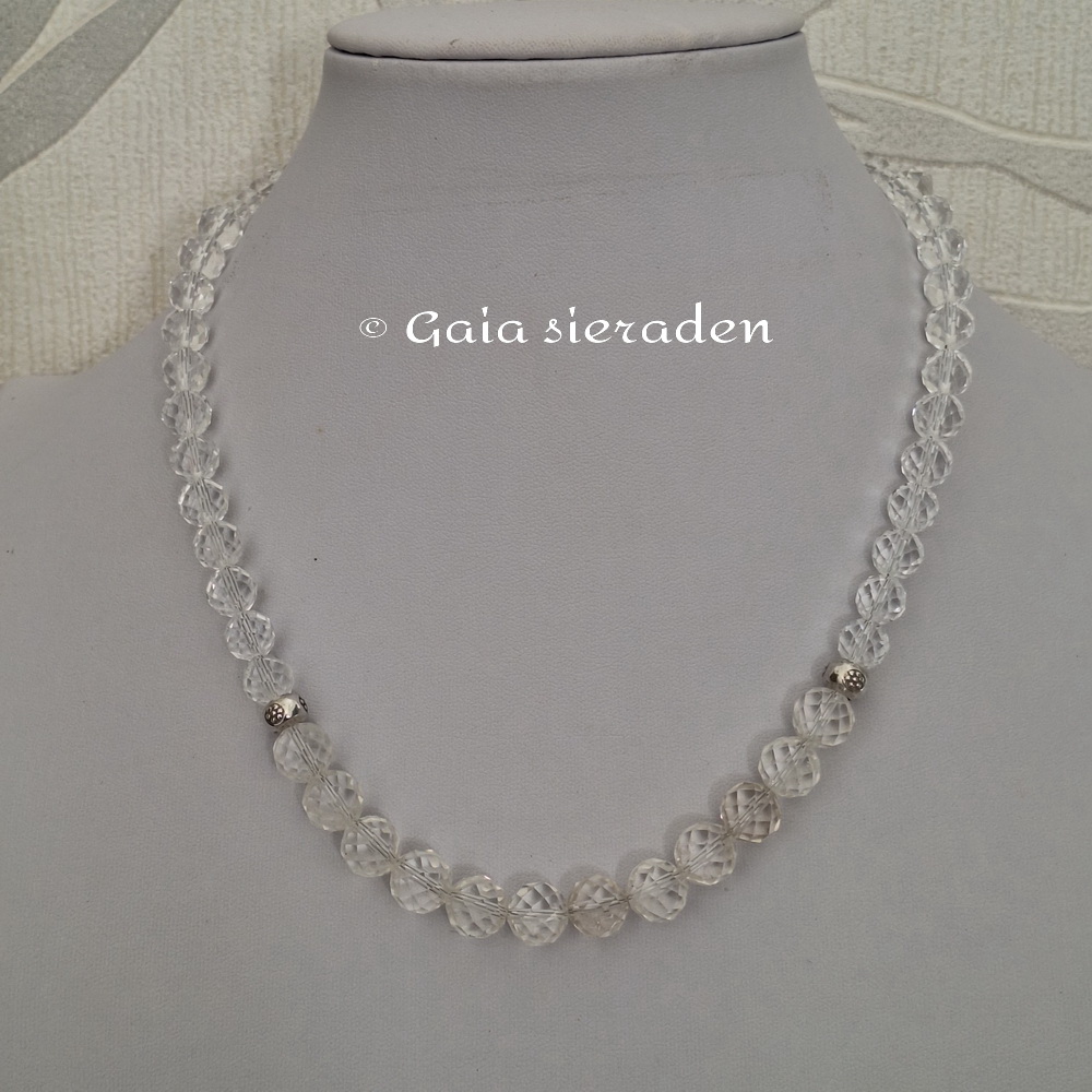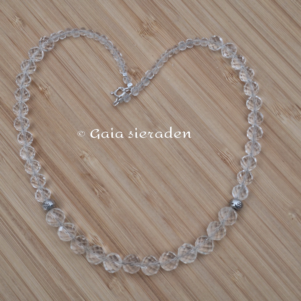 Bergkristal ketting Hera; de ketting heeft prachtige gefacetteerde kralen oplopend van 4 naar 9,5 mm. Aan de zijkanten van de ketting zijn twee zilveren bewerkte kralen geregen die het geheel een speels uiterlijk geven.. Een tijdloze elegante ketting.
