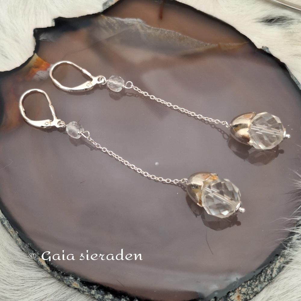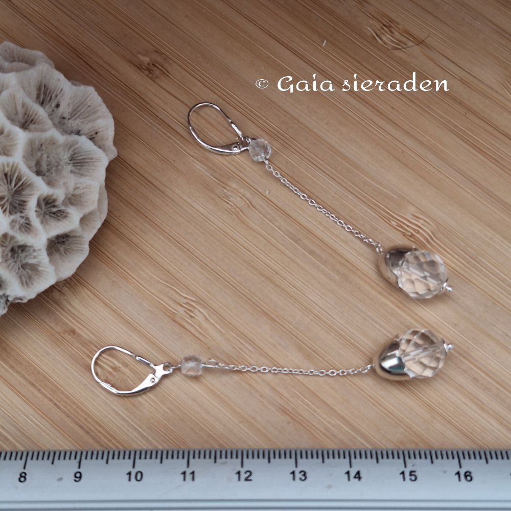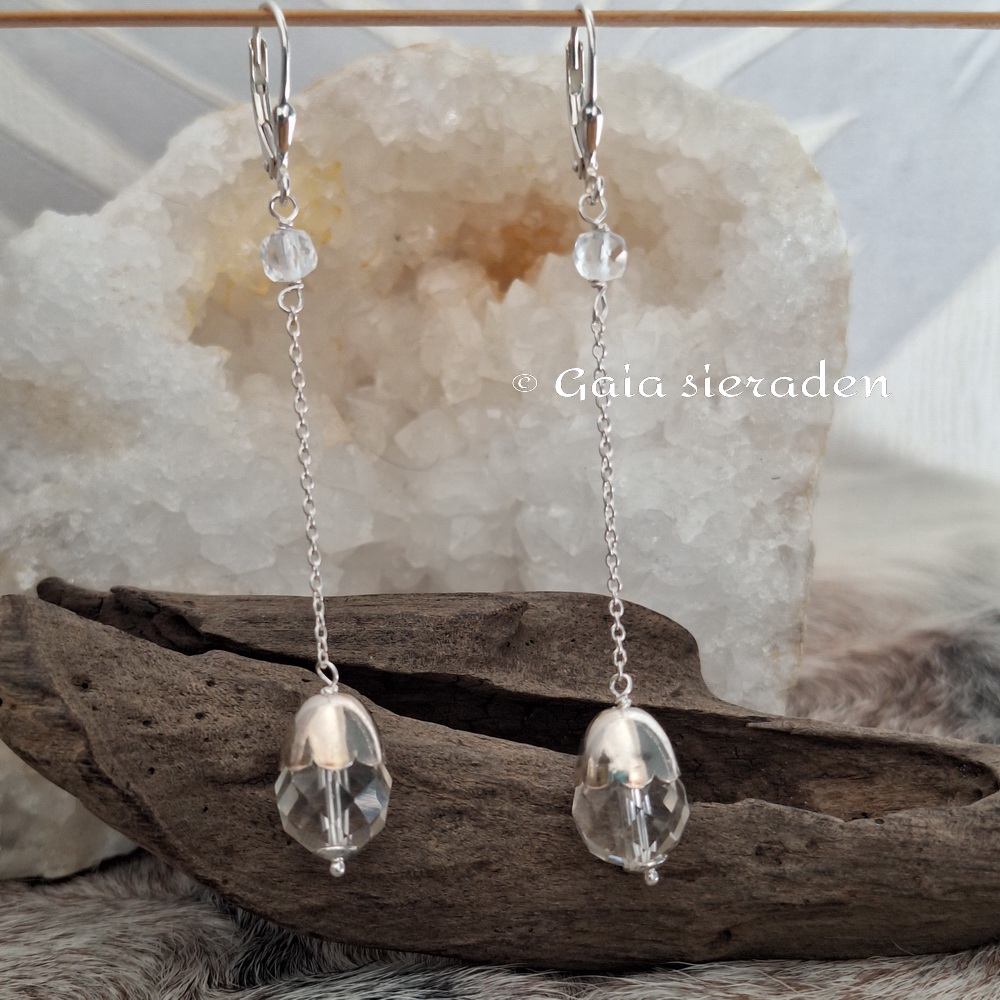 Bergkristal Maxima oorbellen dopje: lange oorbellen met heldere facet geslepen bollen Bergkristal aan een dun zilveren kettinkje onder een zilveren dopje. Aan een mooie zilveren brisuur (klaphaak.) Model Maxima.