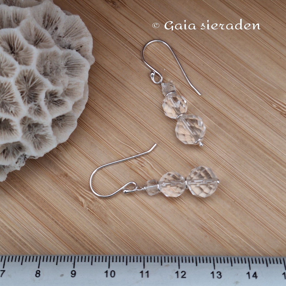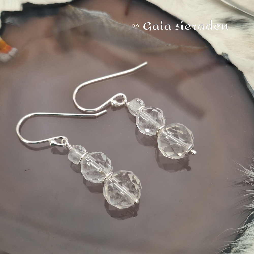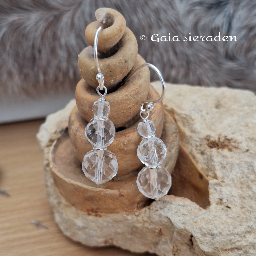 Bergkristal oorbellen facet Trio: leuke oorbellen met heldere facet geslepen bollen Bergkristal en gescheiden met een zilveren ringetje. Aan een zilveren oorhaak.