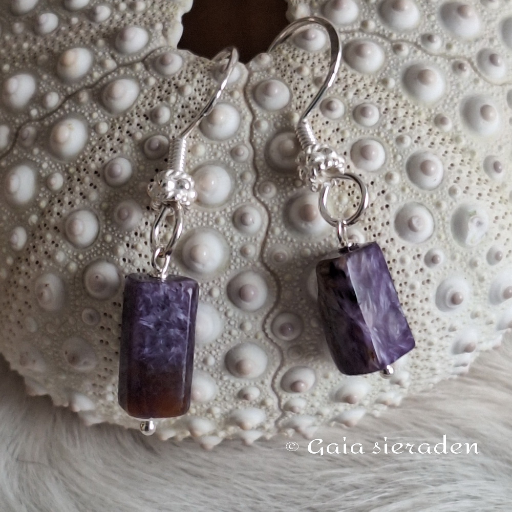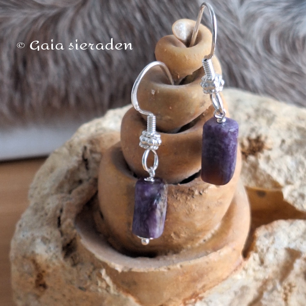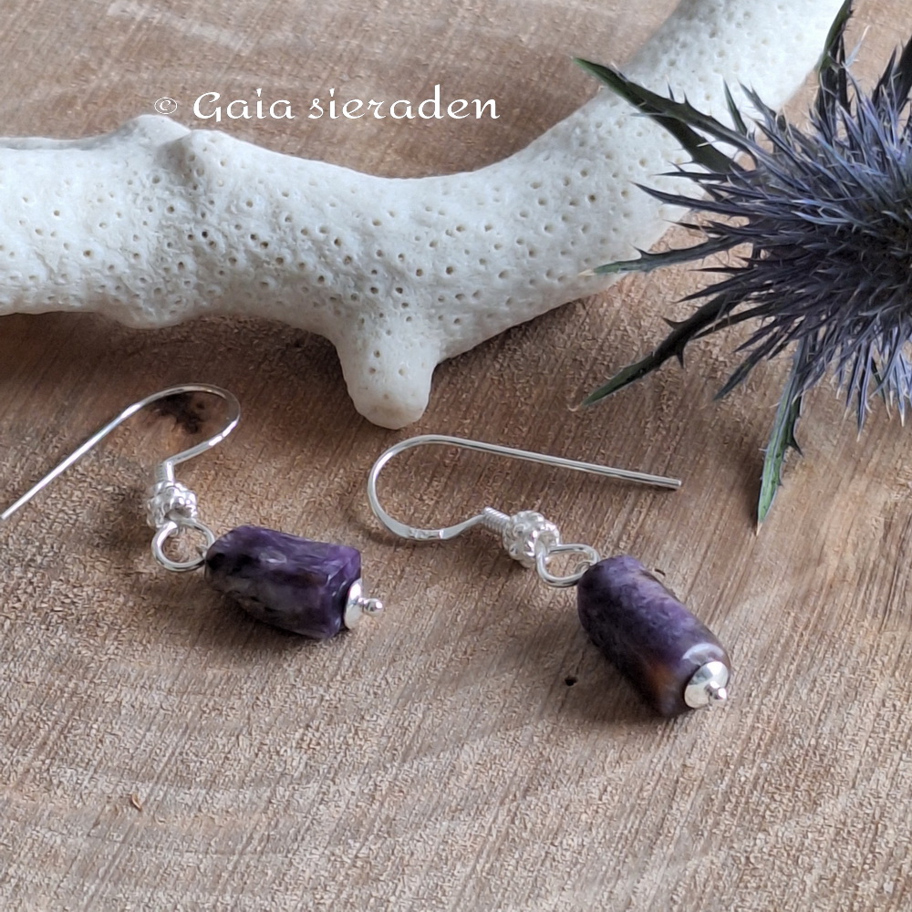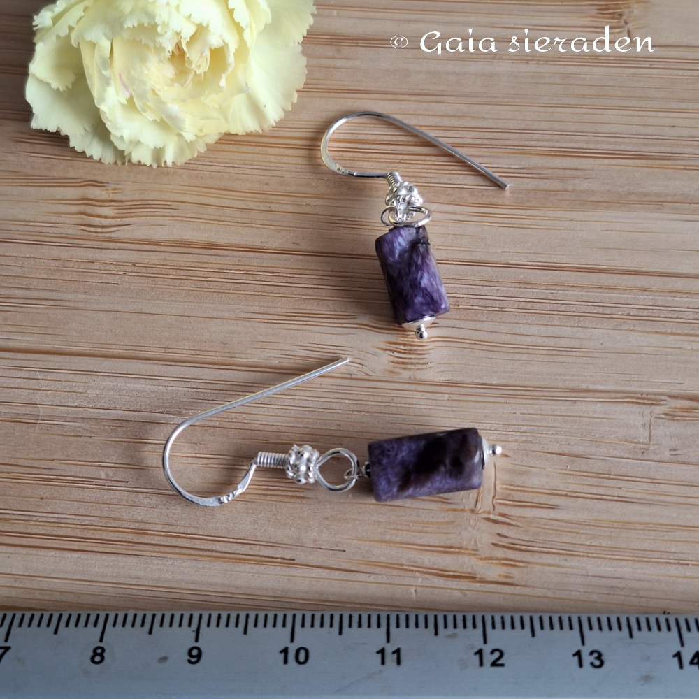 Charoïet oorbellen staafje: mooie oorbellen van een staafje van Charoïet op een zilveren pin en aan een luxe zilveren oorhaak.