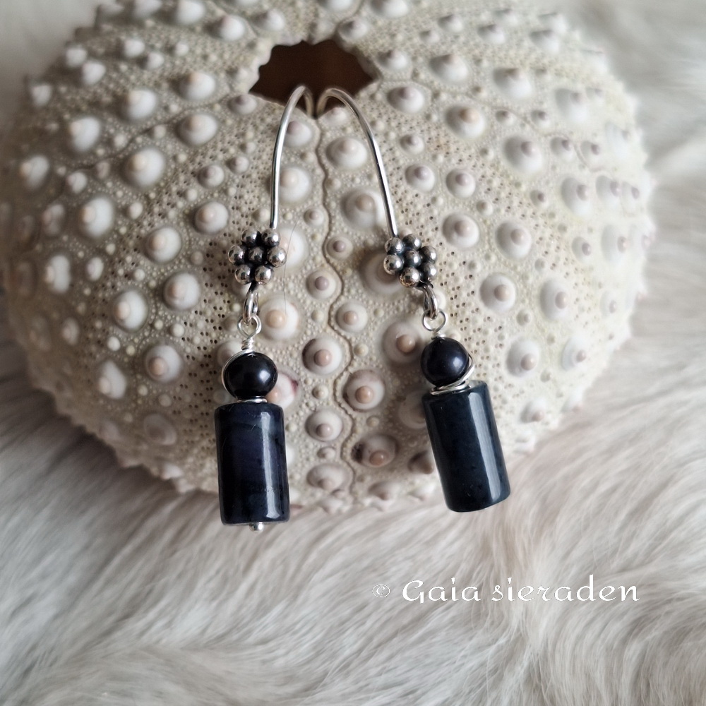 Dumortiriet oorbellen staafje. Mooie oorbellen met een glanzend staafje Dumortiriet en on top een klein blauw zoetwater pareltje op zilveren pin geketteld. Afgewerkt met een zilveren bloemen-oorhaak
