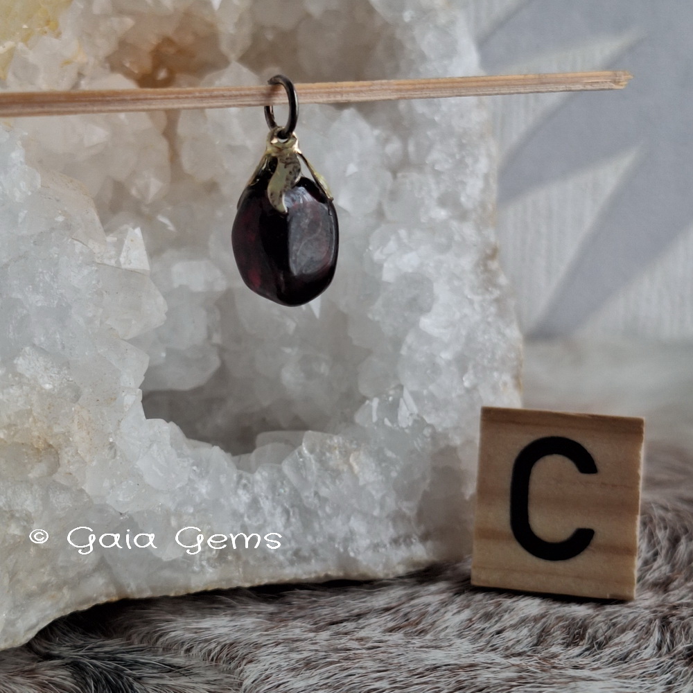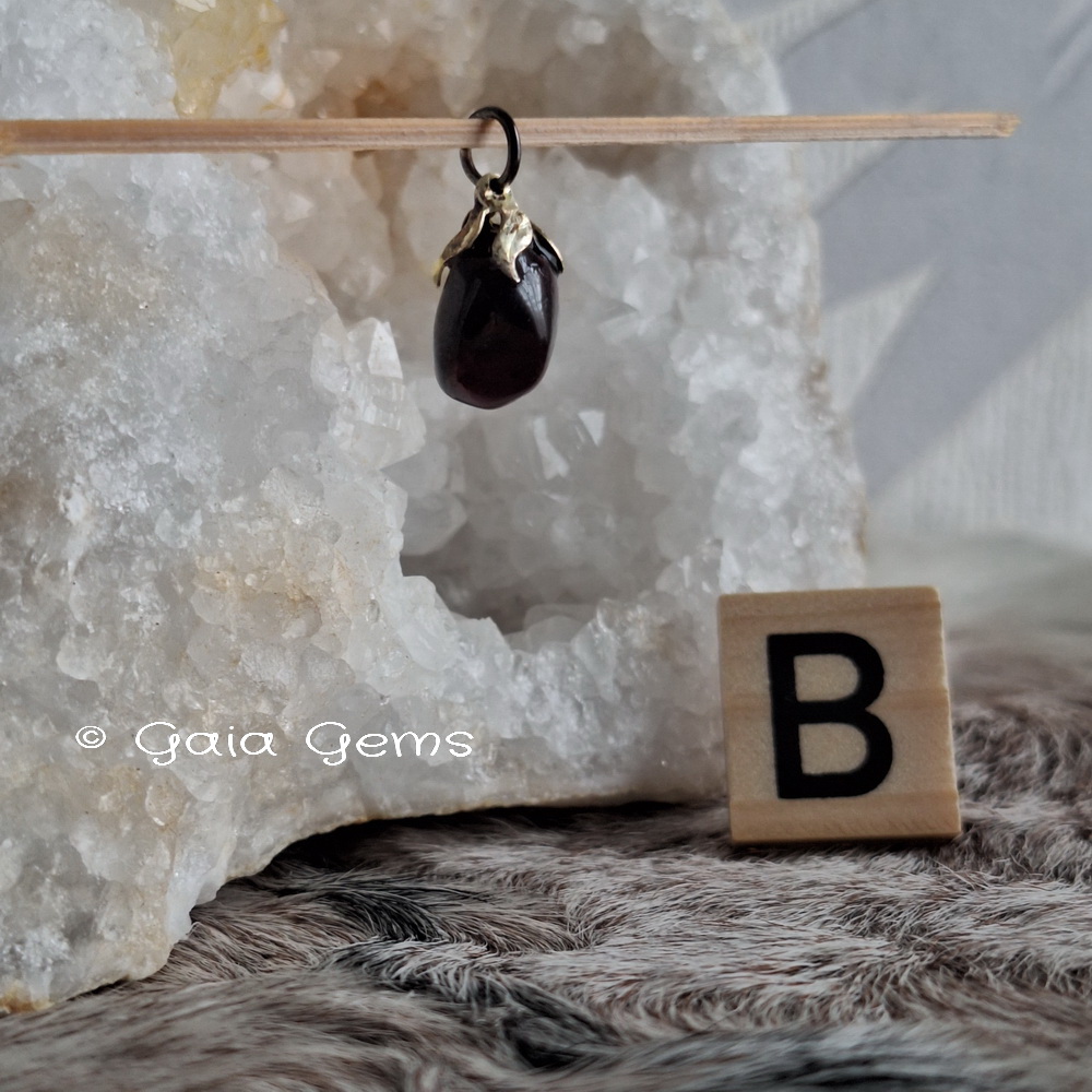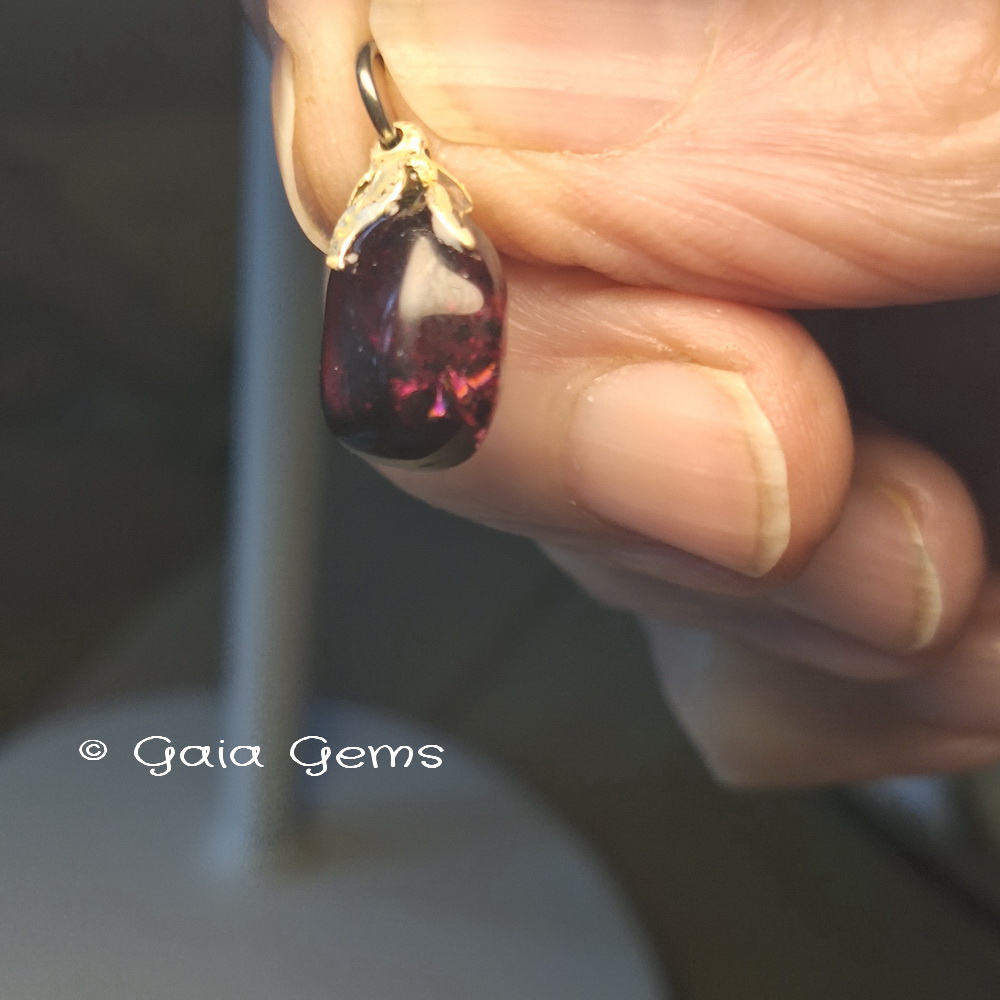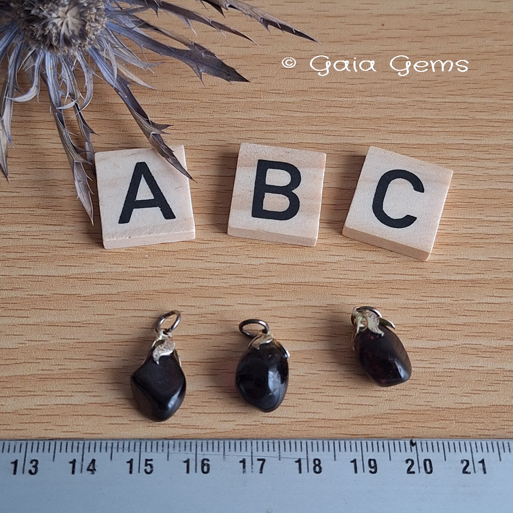 Edelsteen hangertje Granaat. Kleine, maar zeer rode Hessoniet Granaatjes. In het licht zie je pas hoe mooi rood deze hangertjes zijn. Op de foto kan ik het moeilijk vangen.