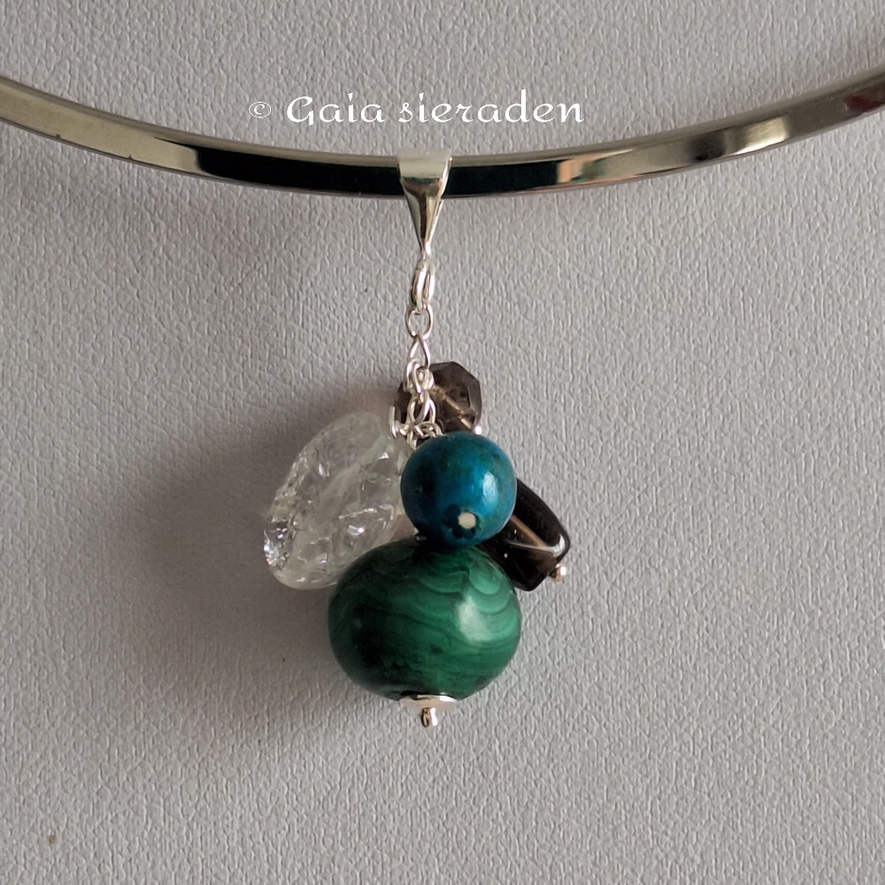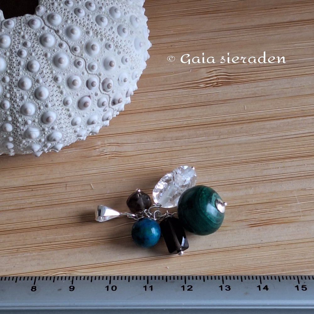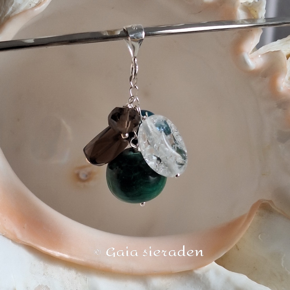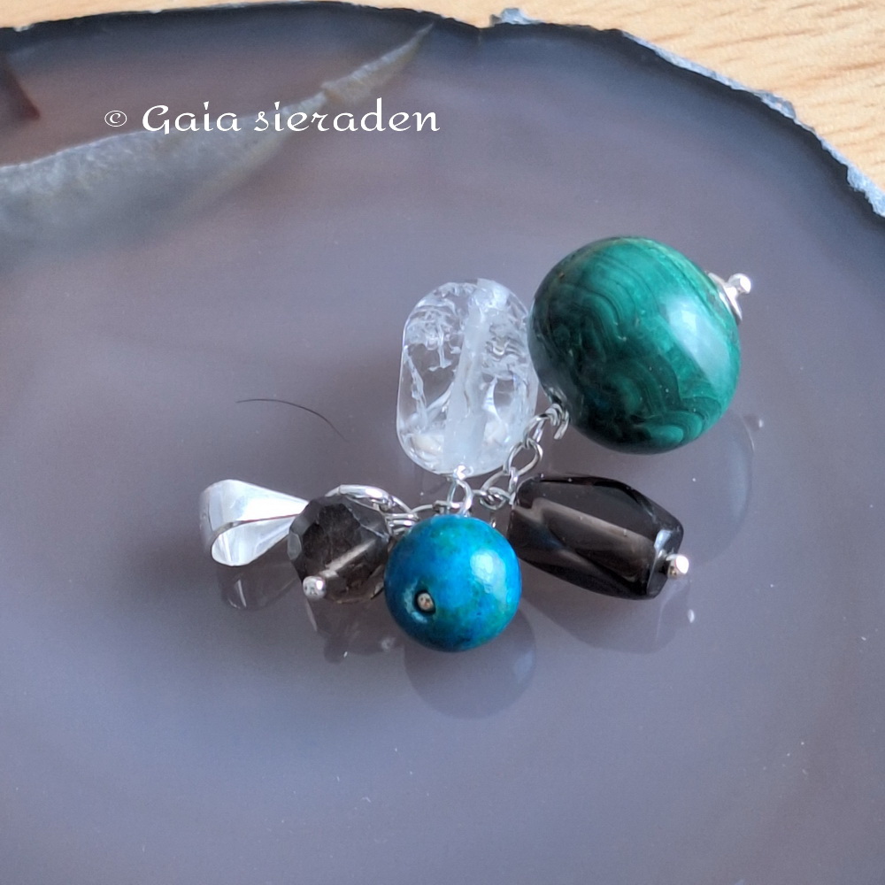 Een mooie hanger met grote 13.5 mm bol natuurlijke Malachiet, bolletje en blokje Rookkwarts, bolletje Chrysocolla en een klompje ice bergkristal. Geketteld met een dunne zilveren pin aan een mooi groot zilveren hangoog. ( zonder spang of ketting )
