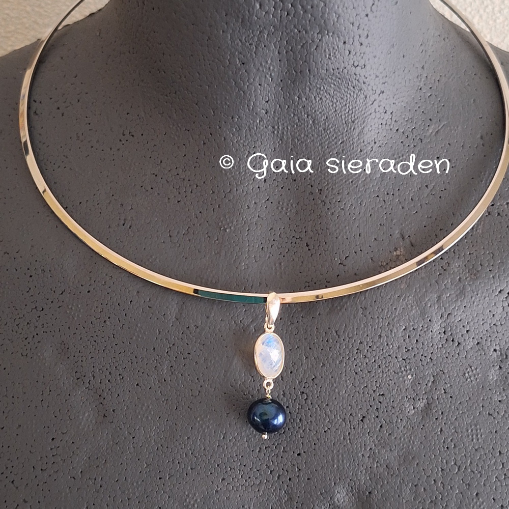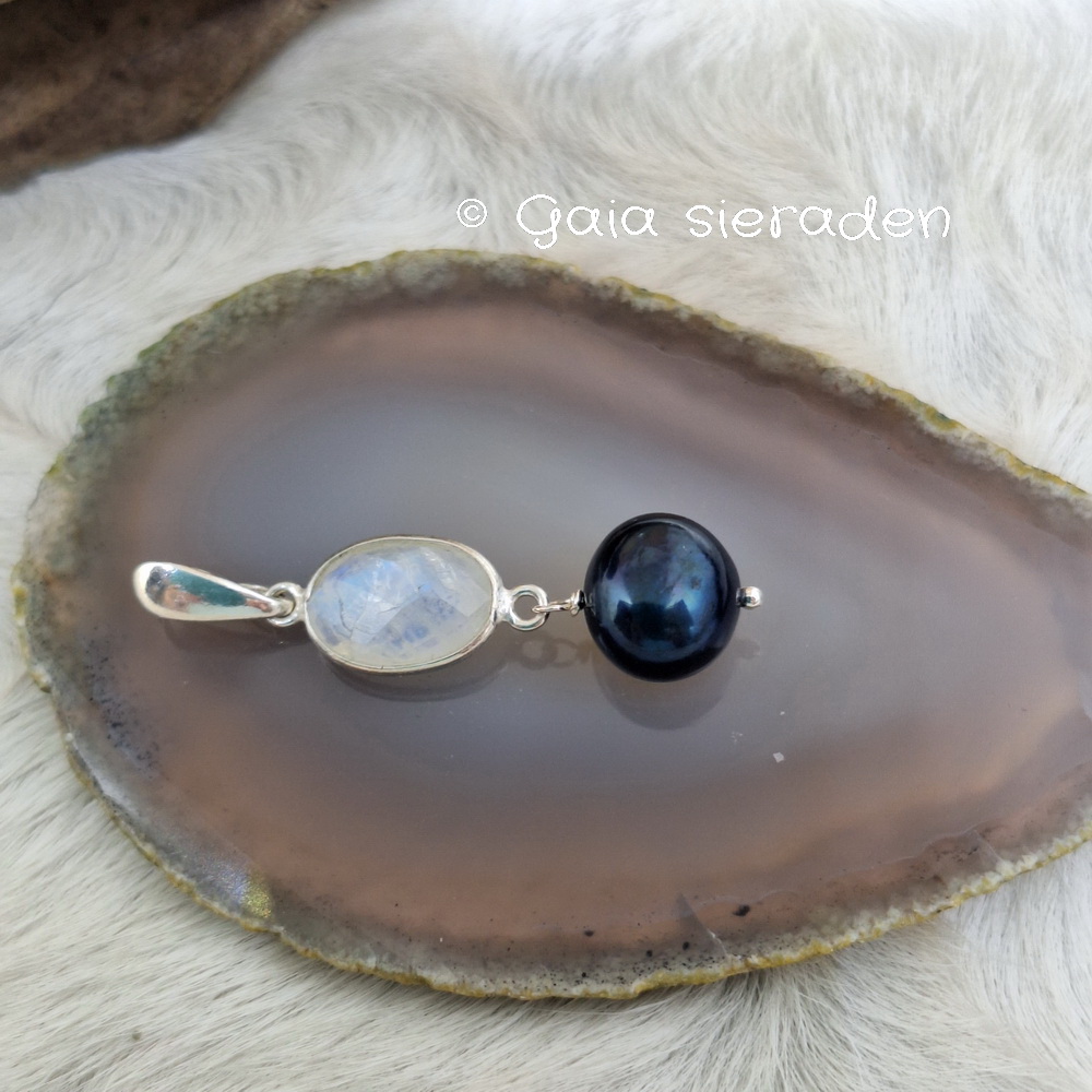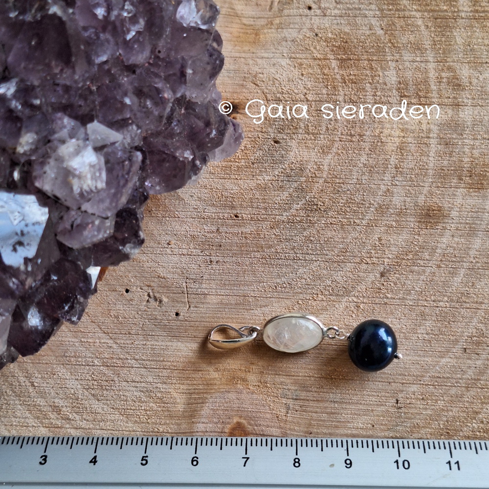 Hanger Maansteen Parel : mooie ovale Maansteen briolette geketteld aan een grote blauwe Parel. Afgewerkt met een luxe zilveren hangoog. (zonder spang)