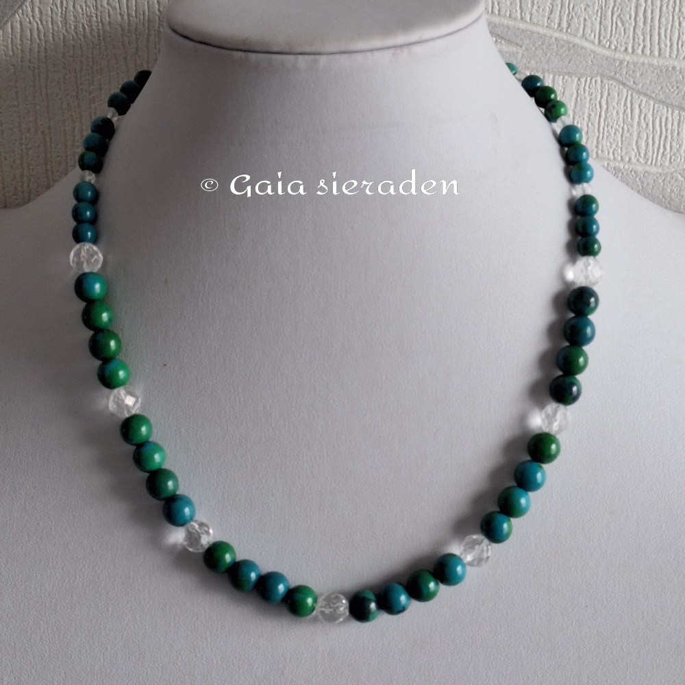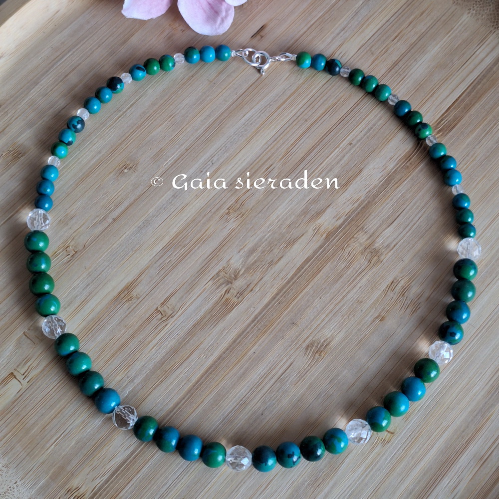 Ketting Chrysocolla en Bergkristal . Mooie ketting met glanzend gepolijste kralen van 8 en 6 mm Chrysocolla. Afgewisseld met heldere gefacetteerde Bergkristal kralen. Afgewerkt met een zilveren veerslotje.