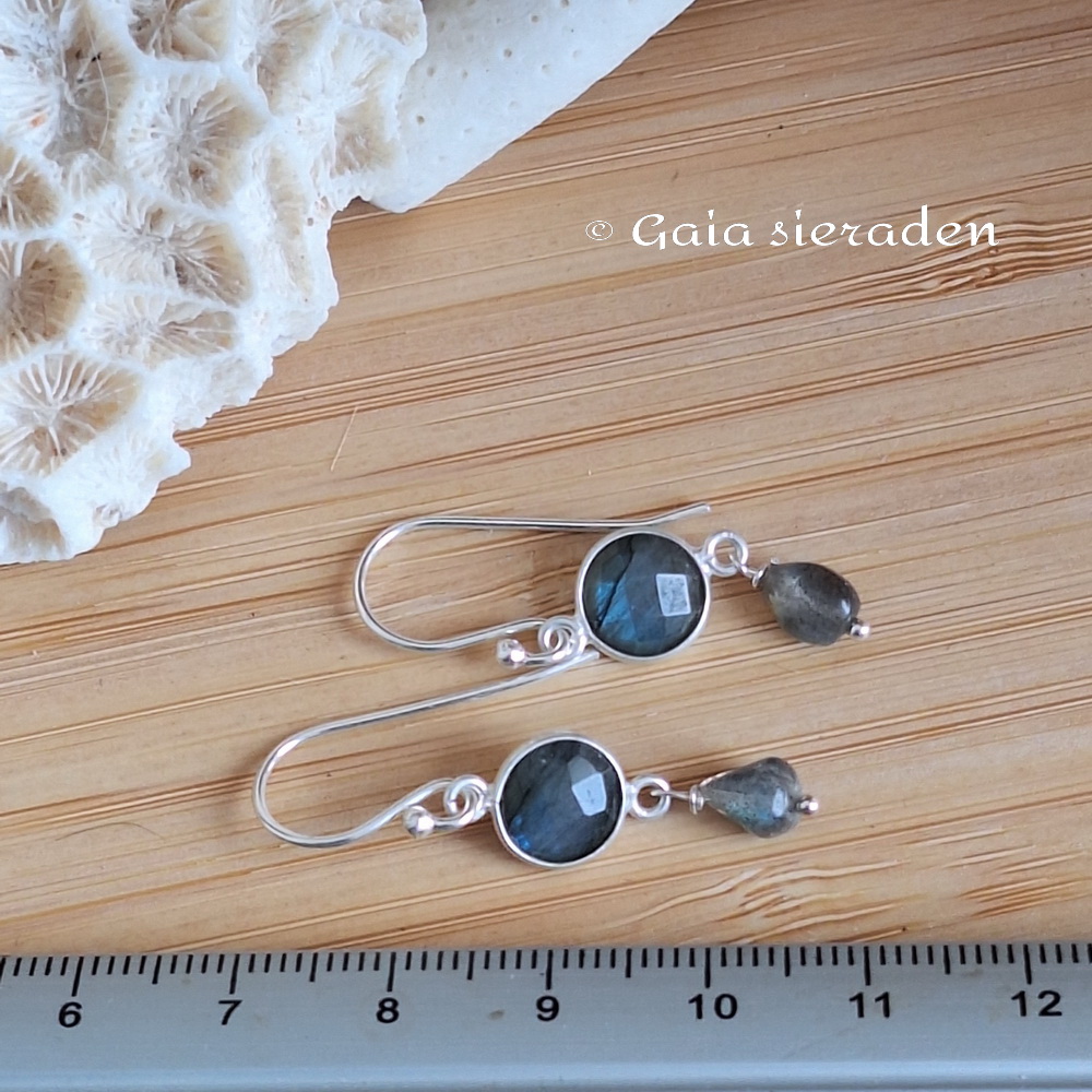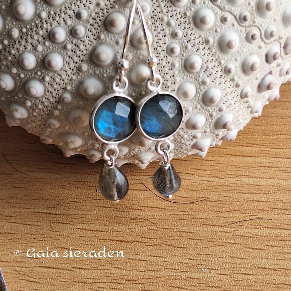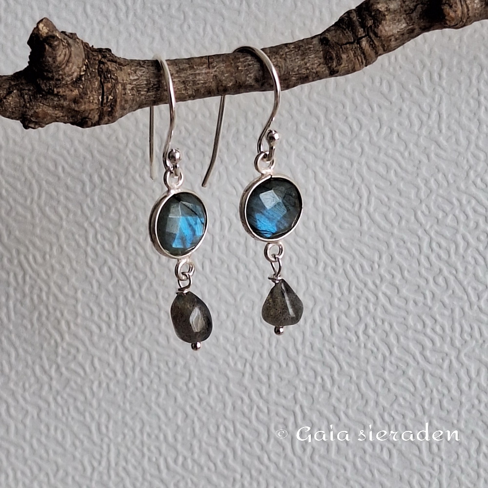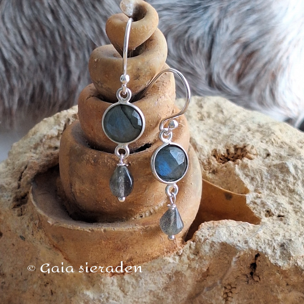 Oorbellen Labradoriet en drupje: Mooie elegante gefacetteerde blauwe brioletten van Labradoriet in een zilveren rand geketteld met klein drupje van Labradoriet, gehangen aan een zilveren oorhaak.