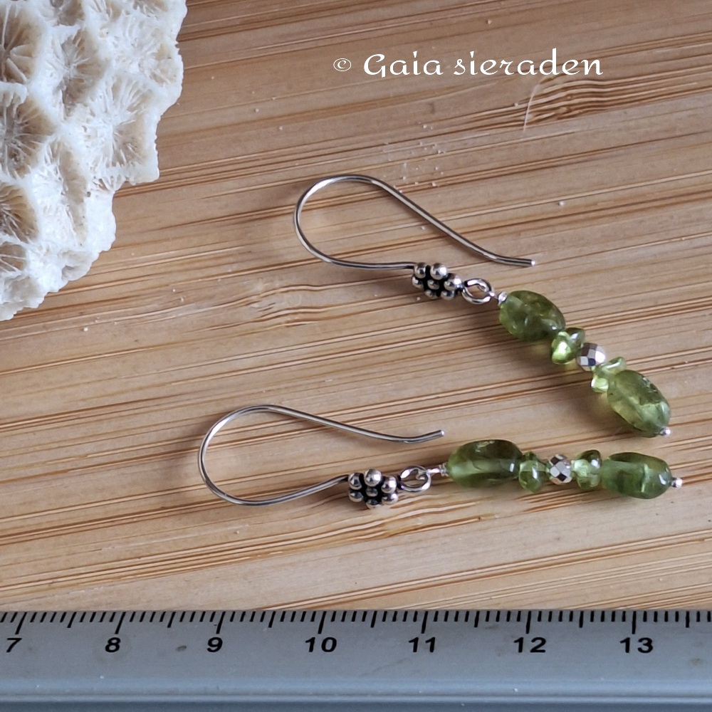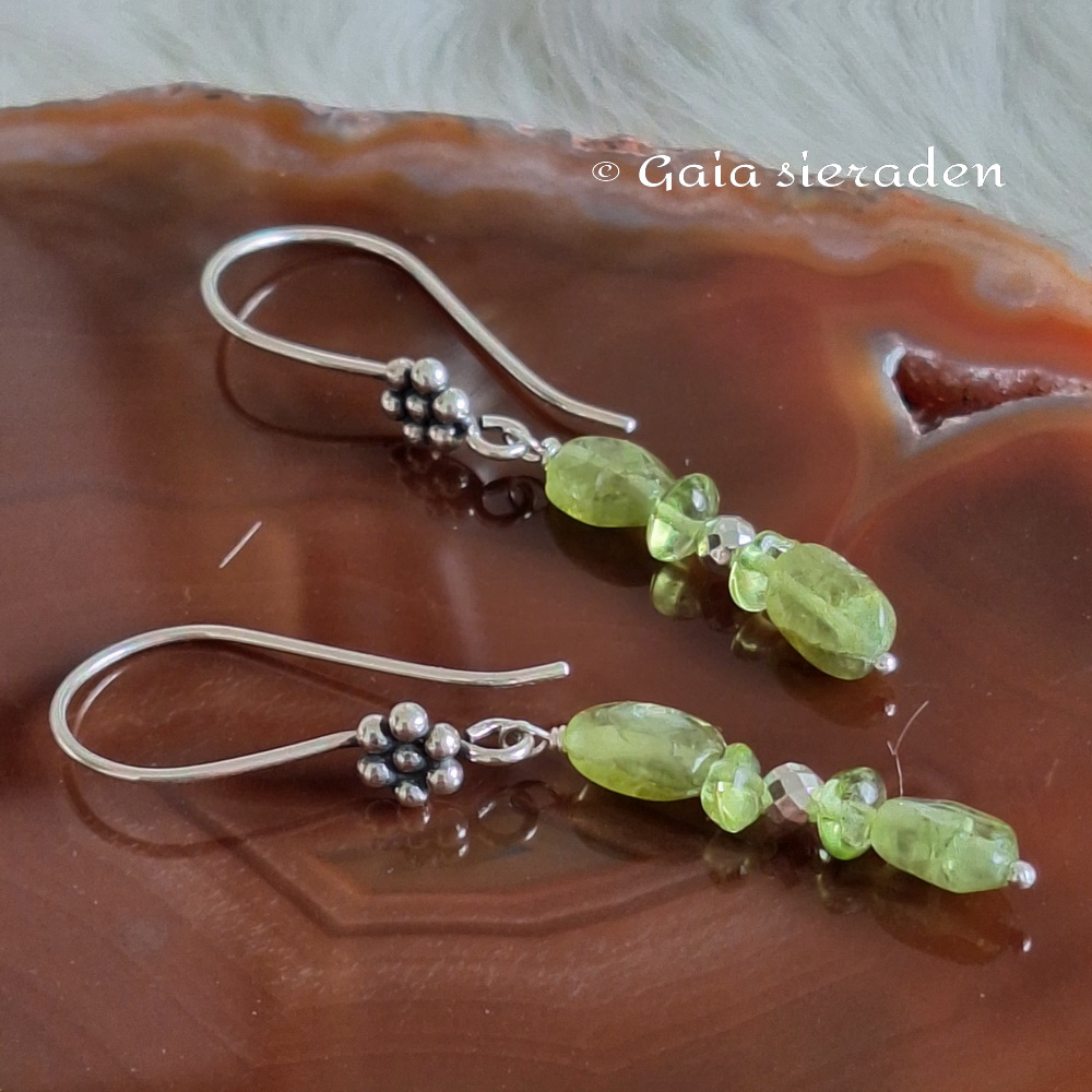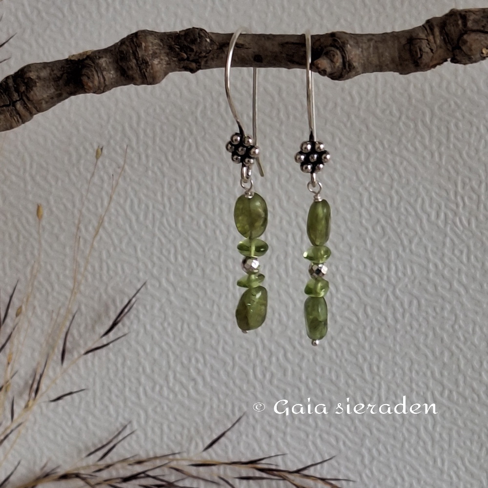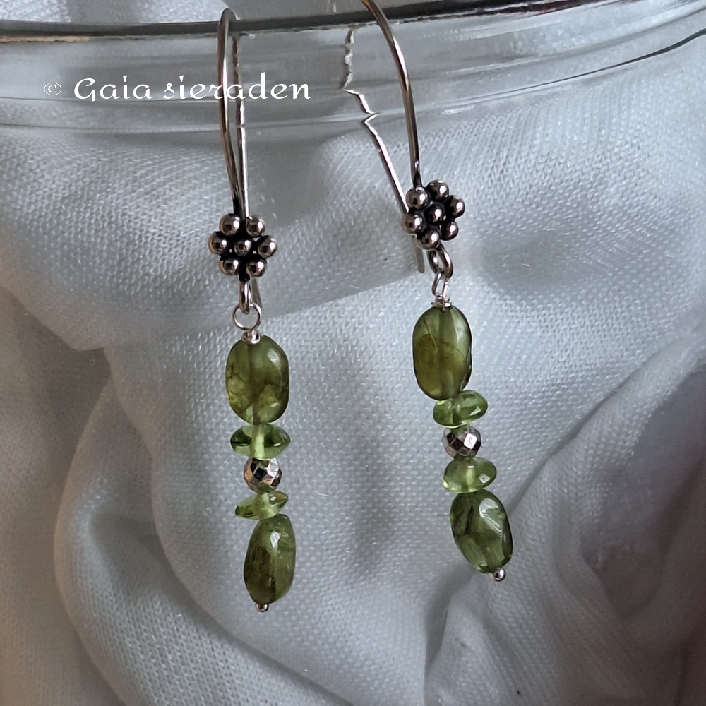 Peridoot oorbellen Verda: Mooie halflange oorbellen met natuurlijke glanzende Peridoot boontjes en kleine rondelletjes op een zilveren pin. Afgewerkt met een mooi zilveren bloem-oorhaak.