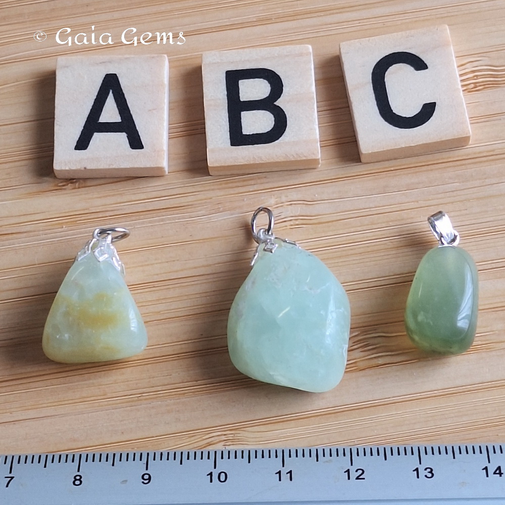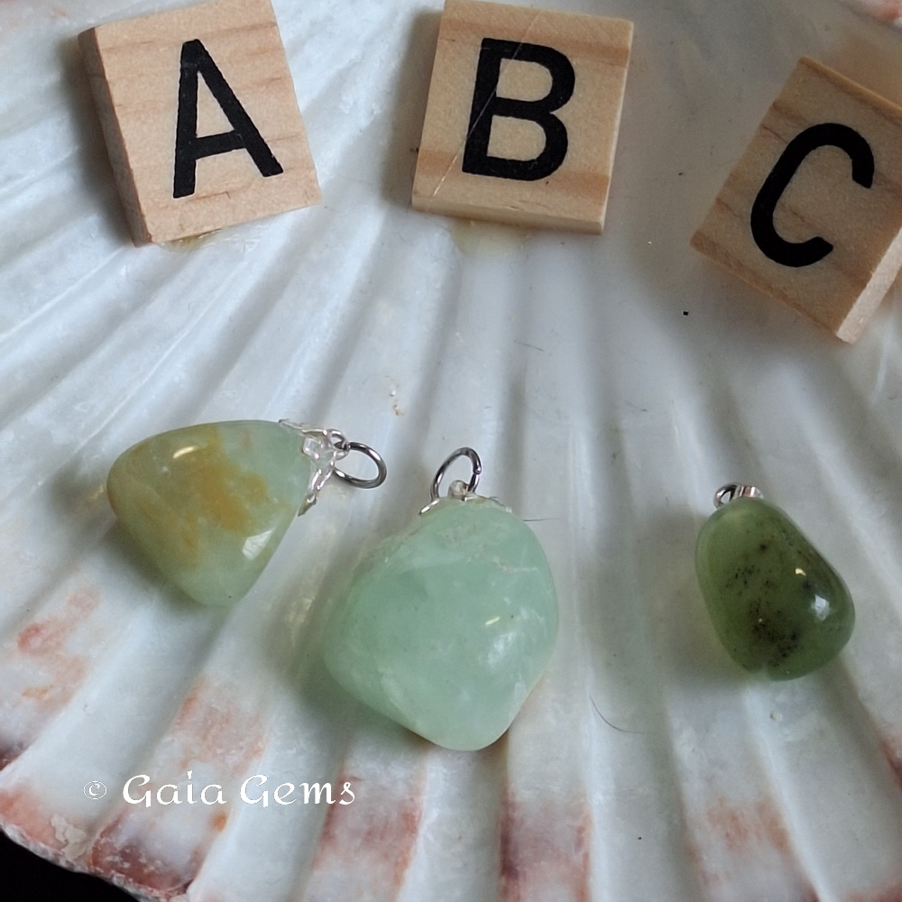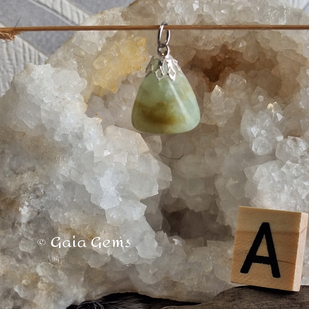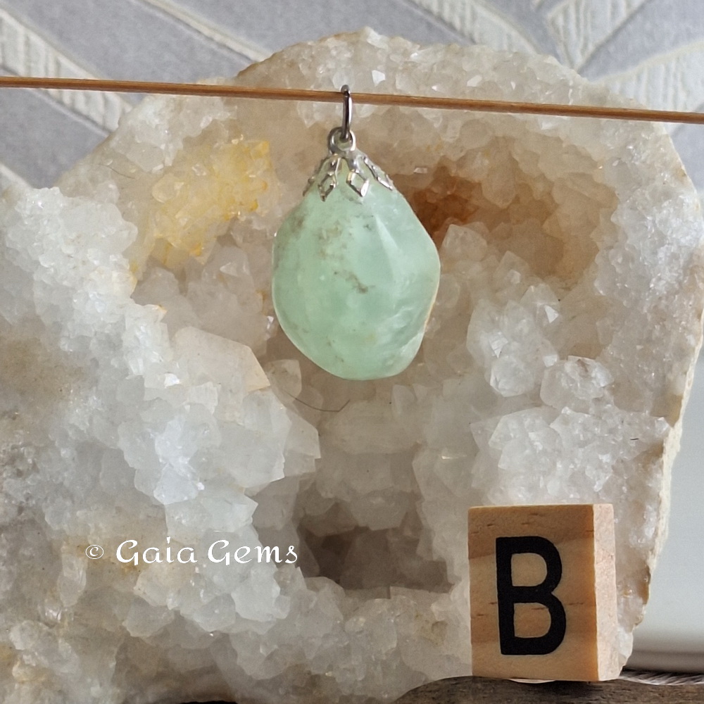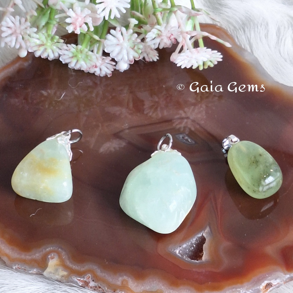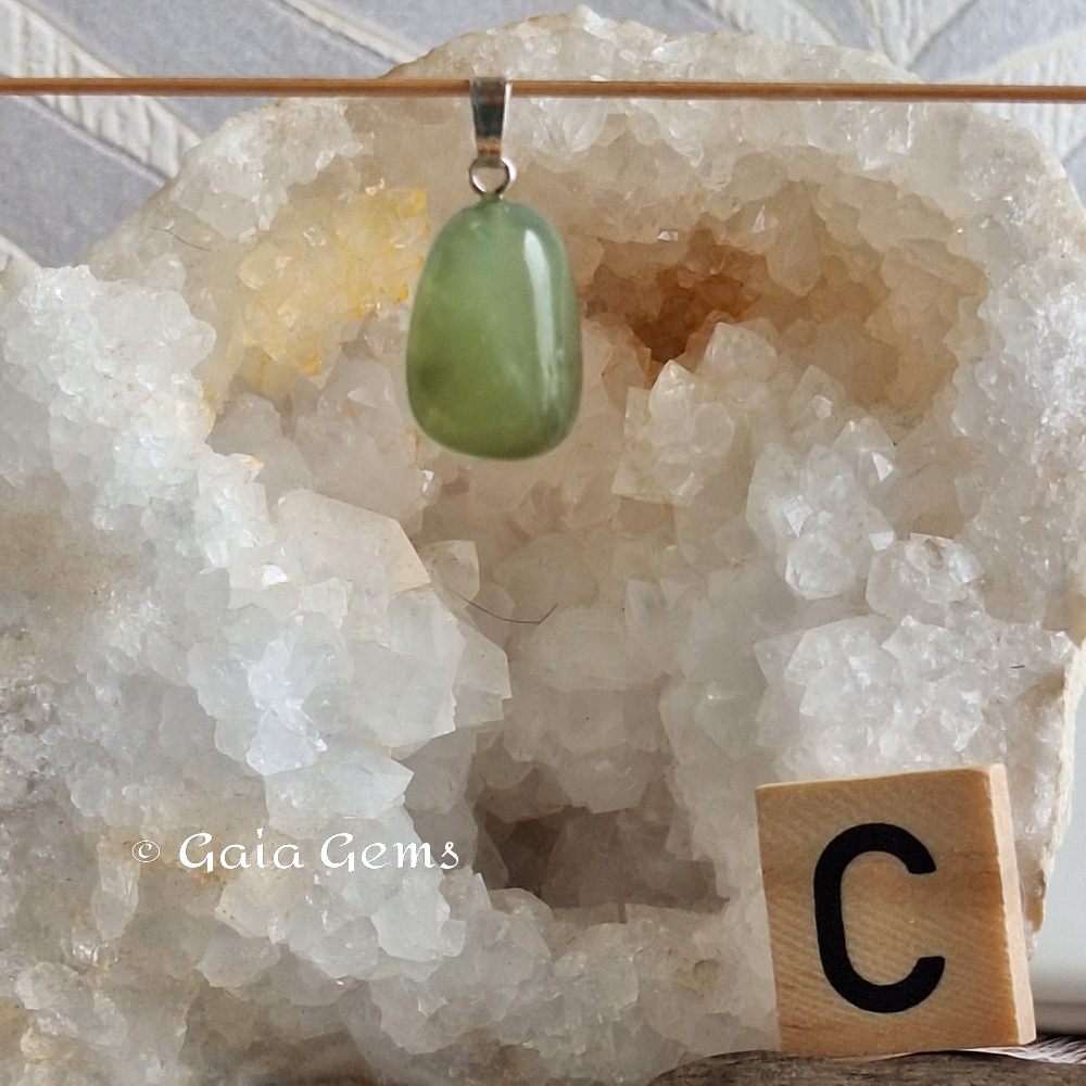 Prehniet edelsteen hanger. De onderdelen is geen zilver maar wel nikkel vrij.