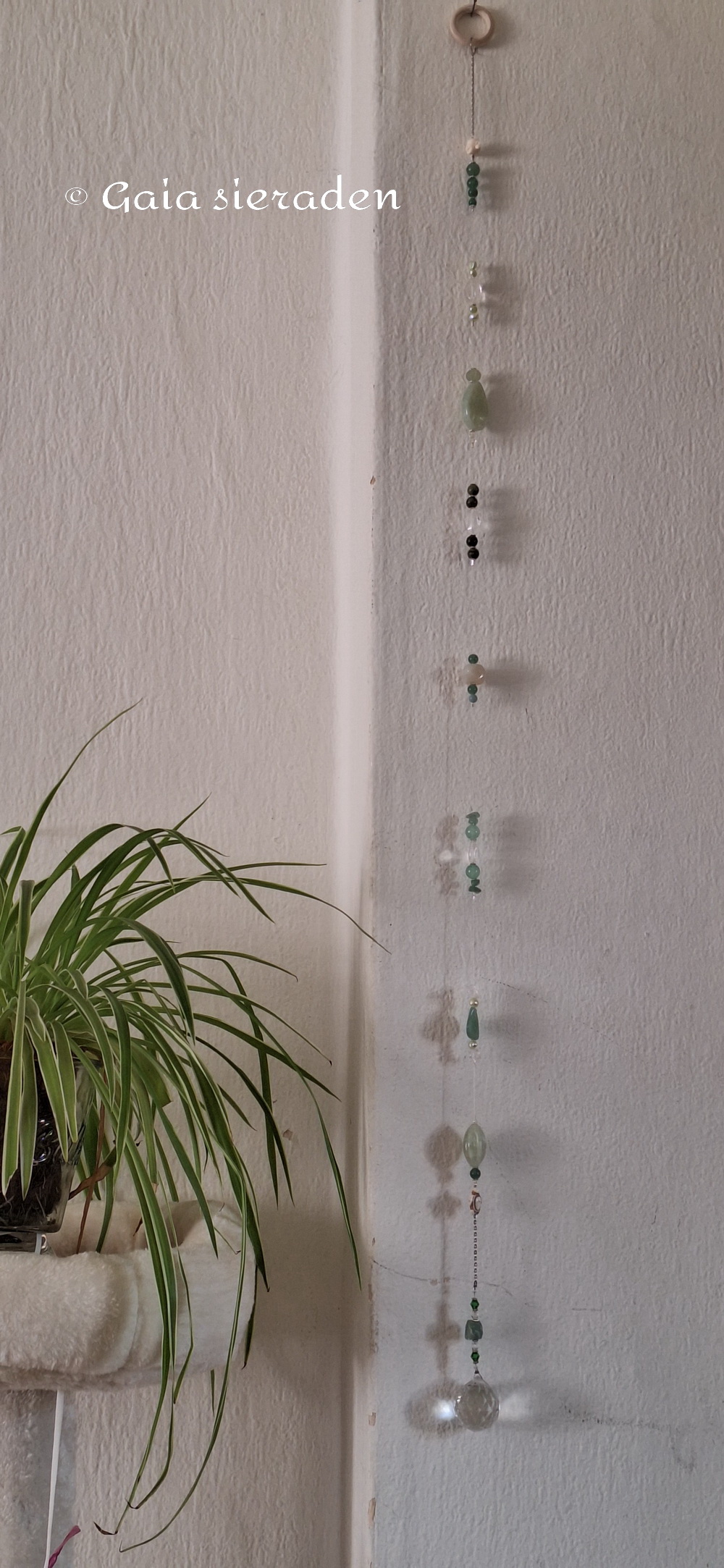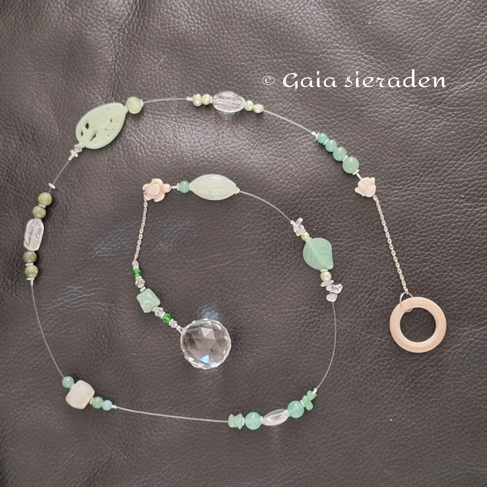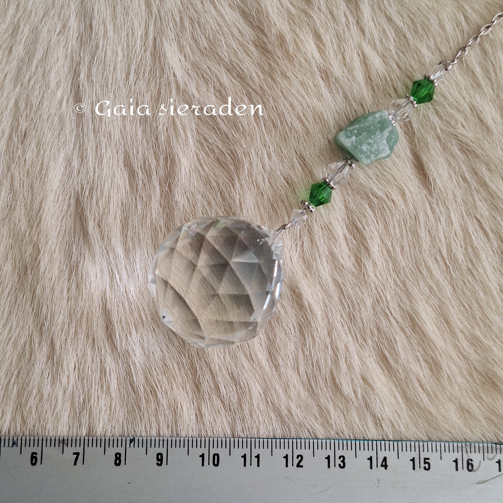 Mooie raamhanger met Aventurijn, Jade en wat Bergkristal. Bovinin zit een klein Boeddha hoofdje geregen en aan de voet een schildpadje. De grote gefacetteerde kristallen bol is een echte zonnevanger.