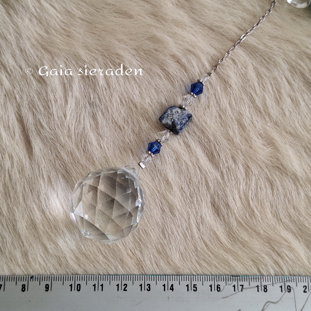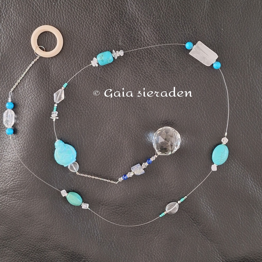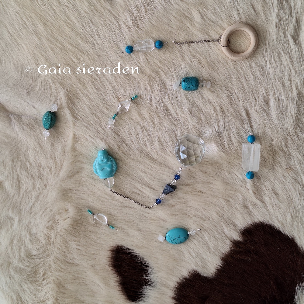Mooie raamhanger met Turquase geverfde Howliet en Bergkristal. Onderaan is een turquase blauwe Boeddha geregen. De grote gefacetteerde kristallen bol hangt aan een natuurlijke Lapis Lazuli en heeft een Ø van 3 cm.
