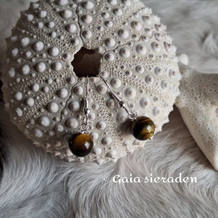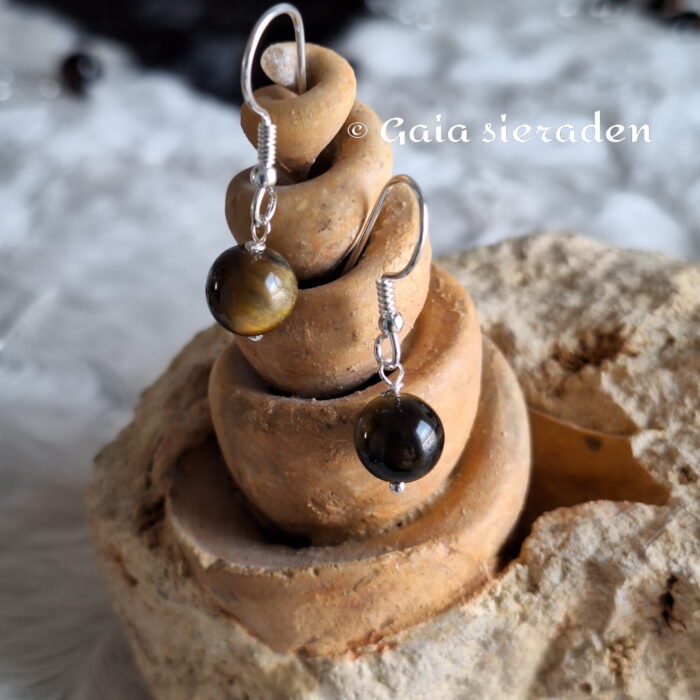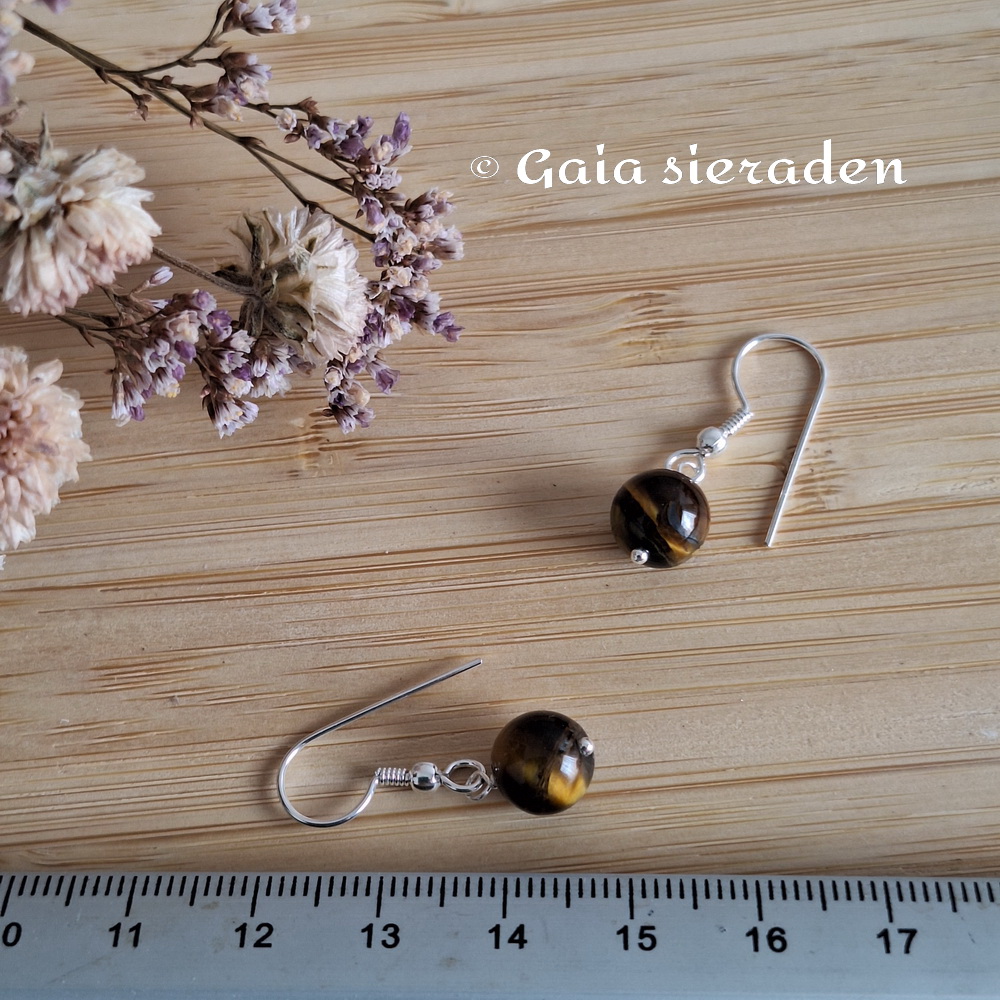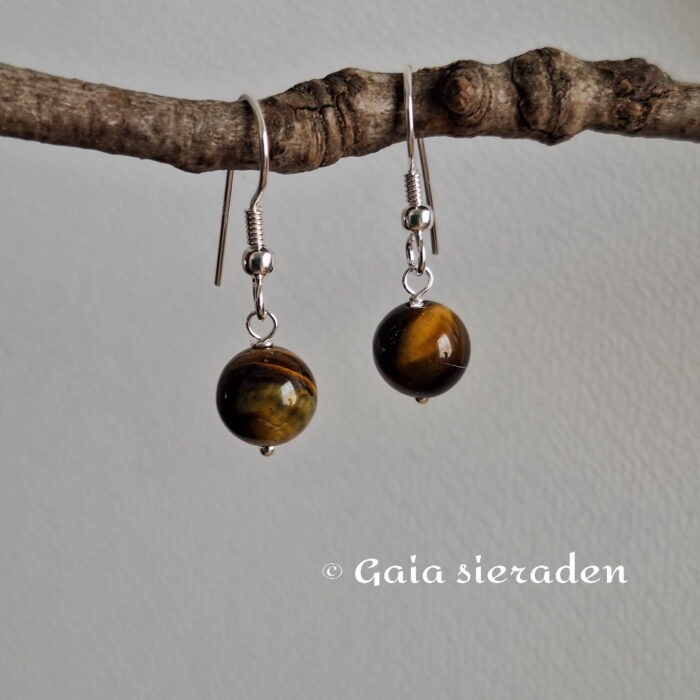 Leuke oorbellen van een mooie glanzende bruine bol Tijgeroog op zilveren pin aan een zilveren oorhaak.