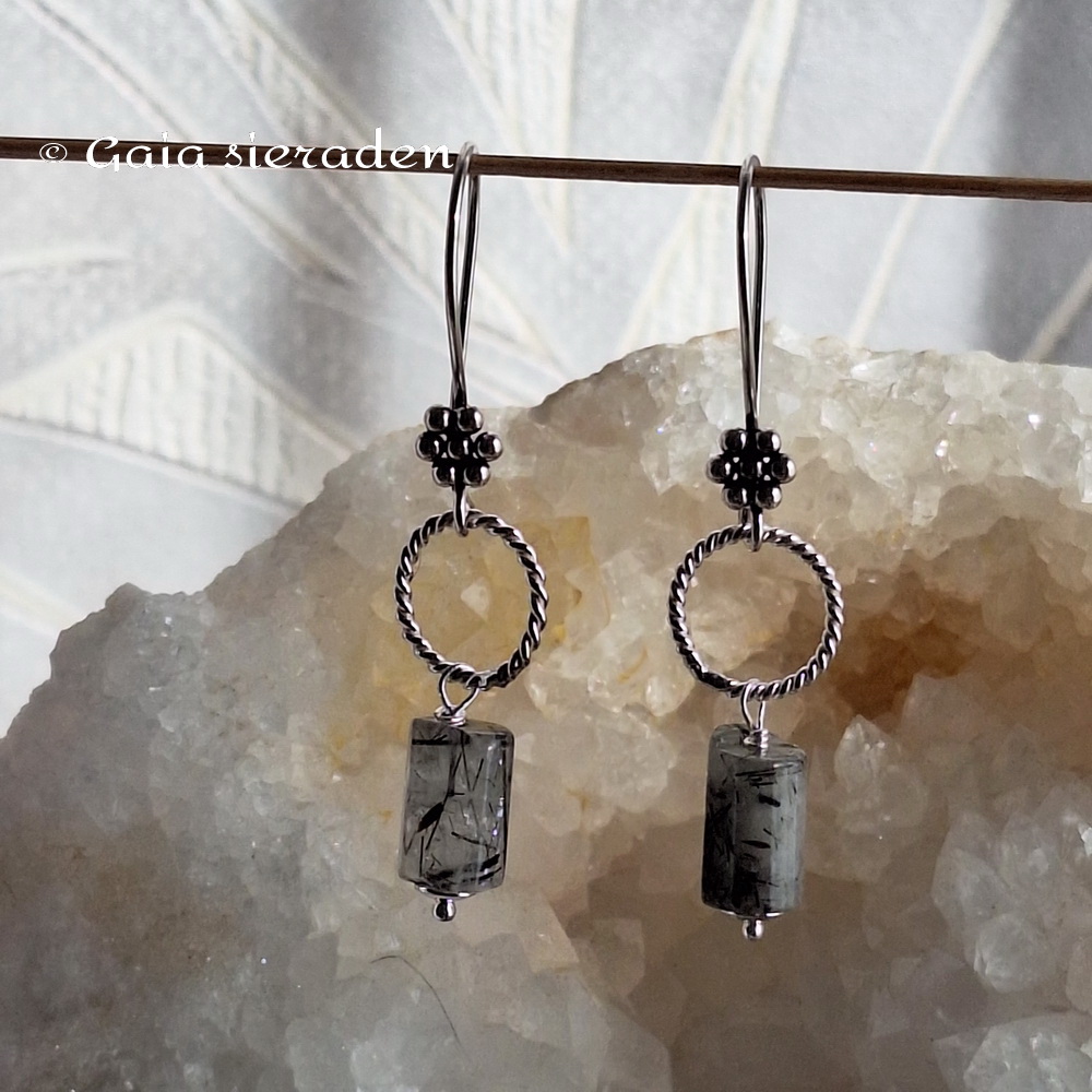 Mooie glanzende staafjes Toermalijnkwarts op een zilveren pin geketteld aan een zilveren ring. Afgewerkt met een mooie zilveren bloemhaak.