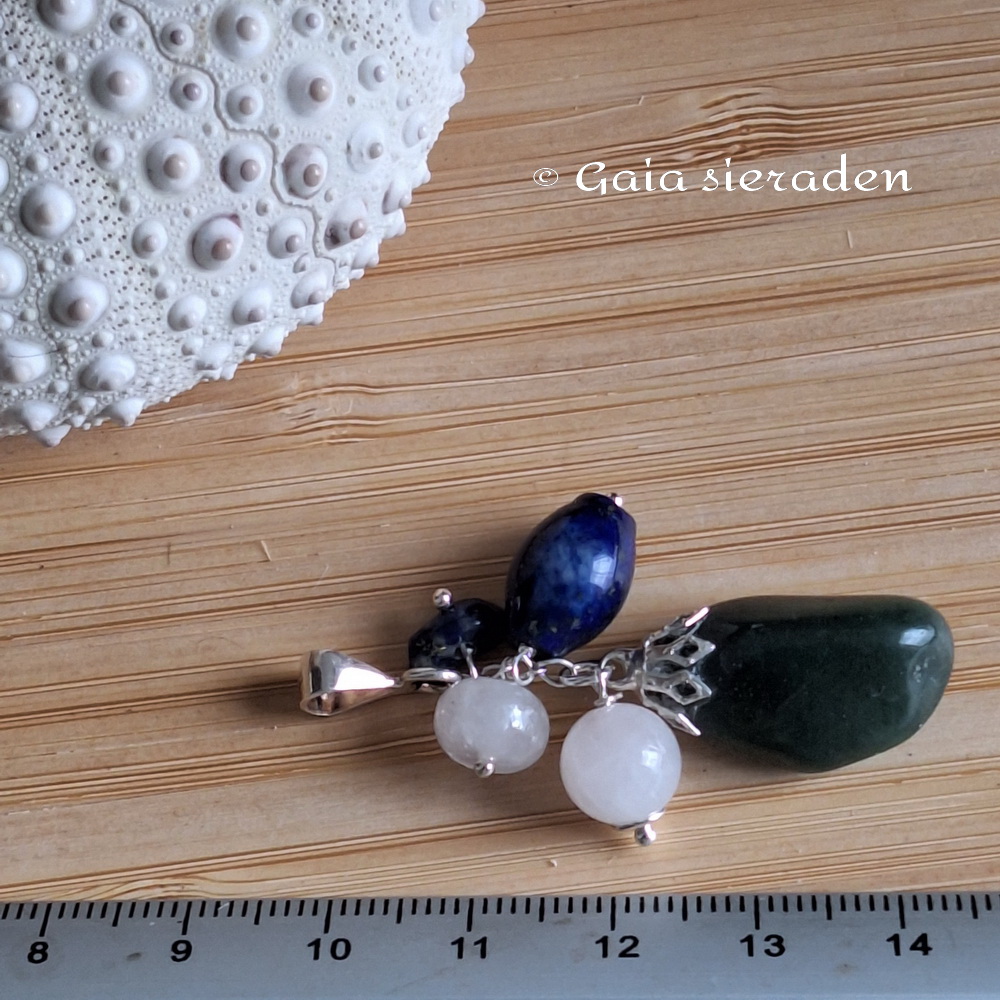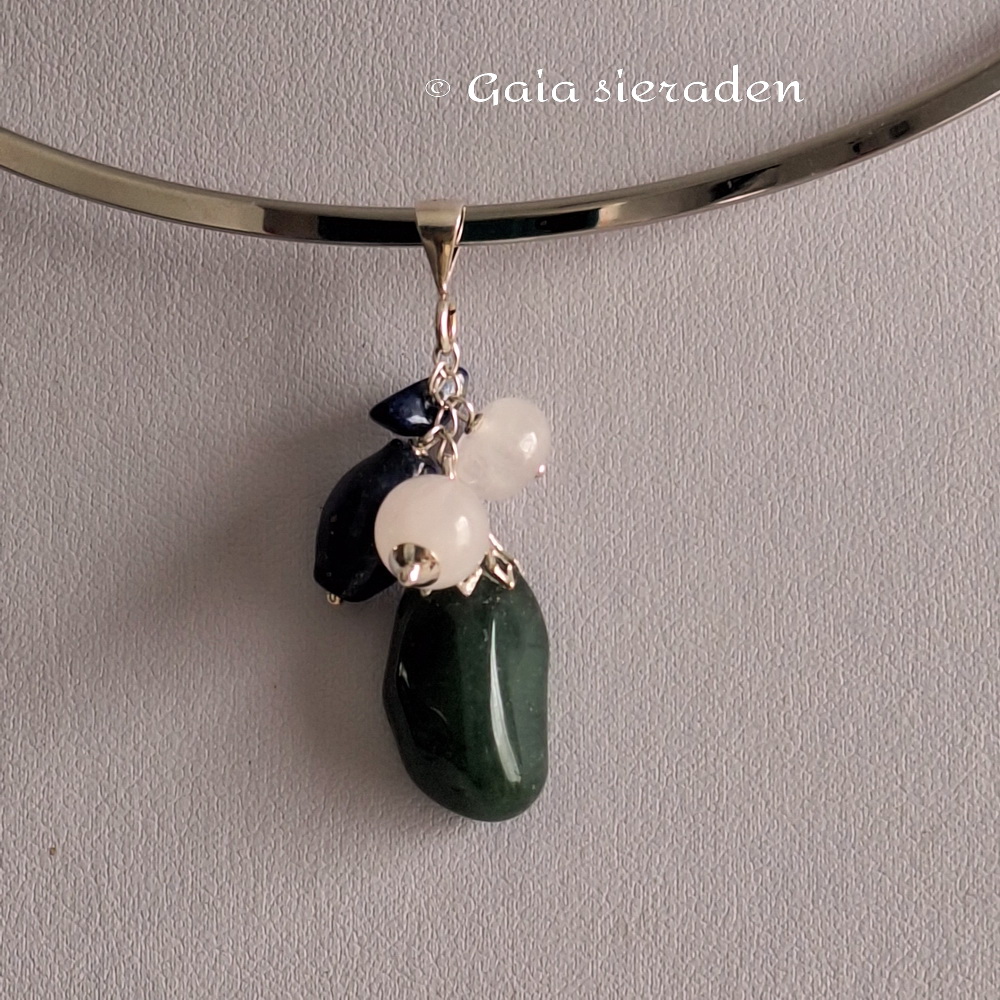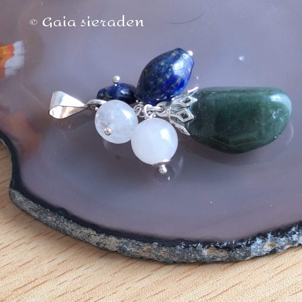 Grote hanger van Aventurijn, 2 bolletje Rozekwartsen een tonnetje Lapis Lazuli. Geketteld op zilveren pin aan een groot zilveren hangoog. (zonder spang)