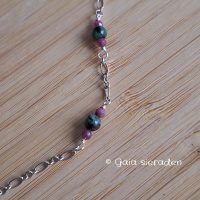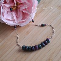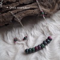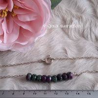 - De zoisïet kralen zijn 8 x 5 mm Ø en de robijntjes 2 mm Ø.